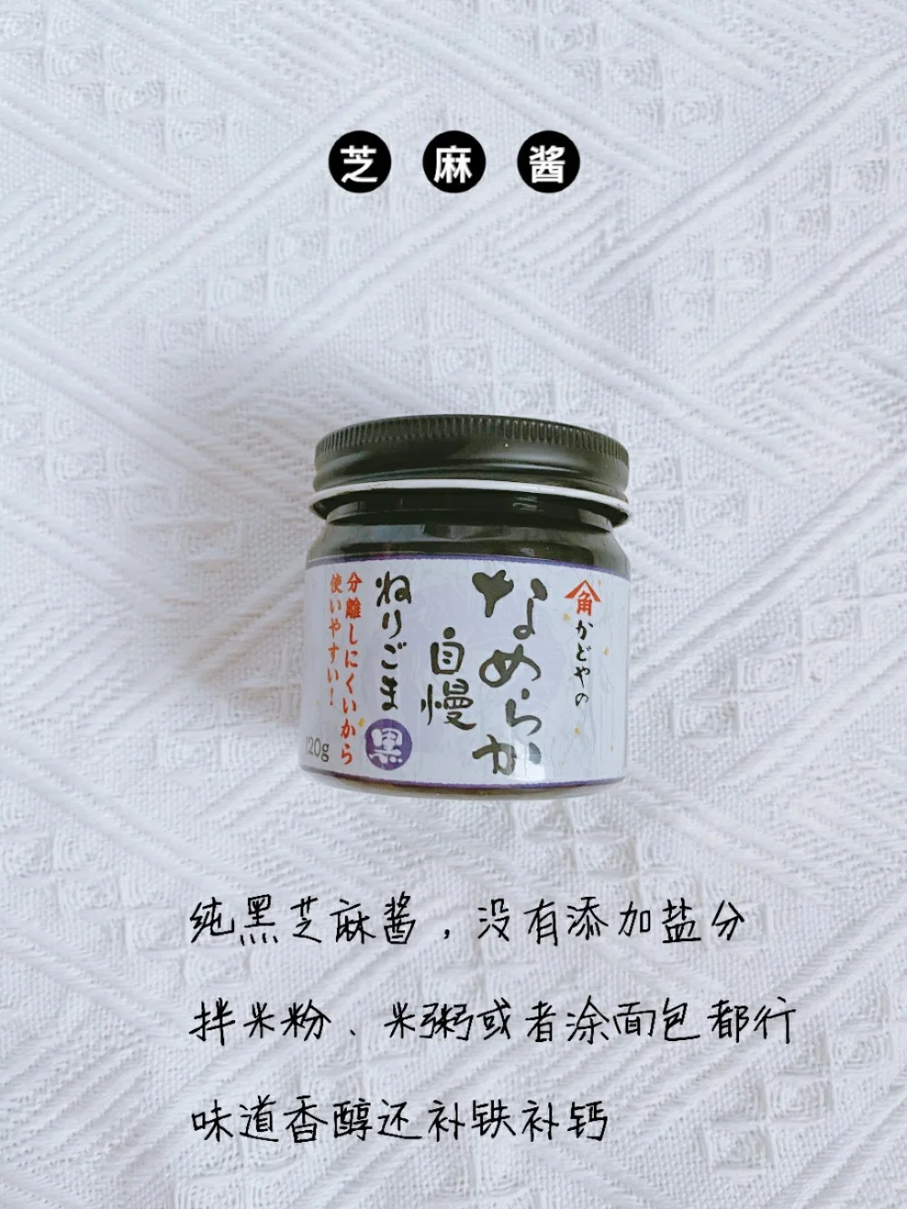 很香醇的黑芝麻酱,没有添加盐分,平时用来拌粥、抹面包都好吃。