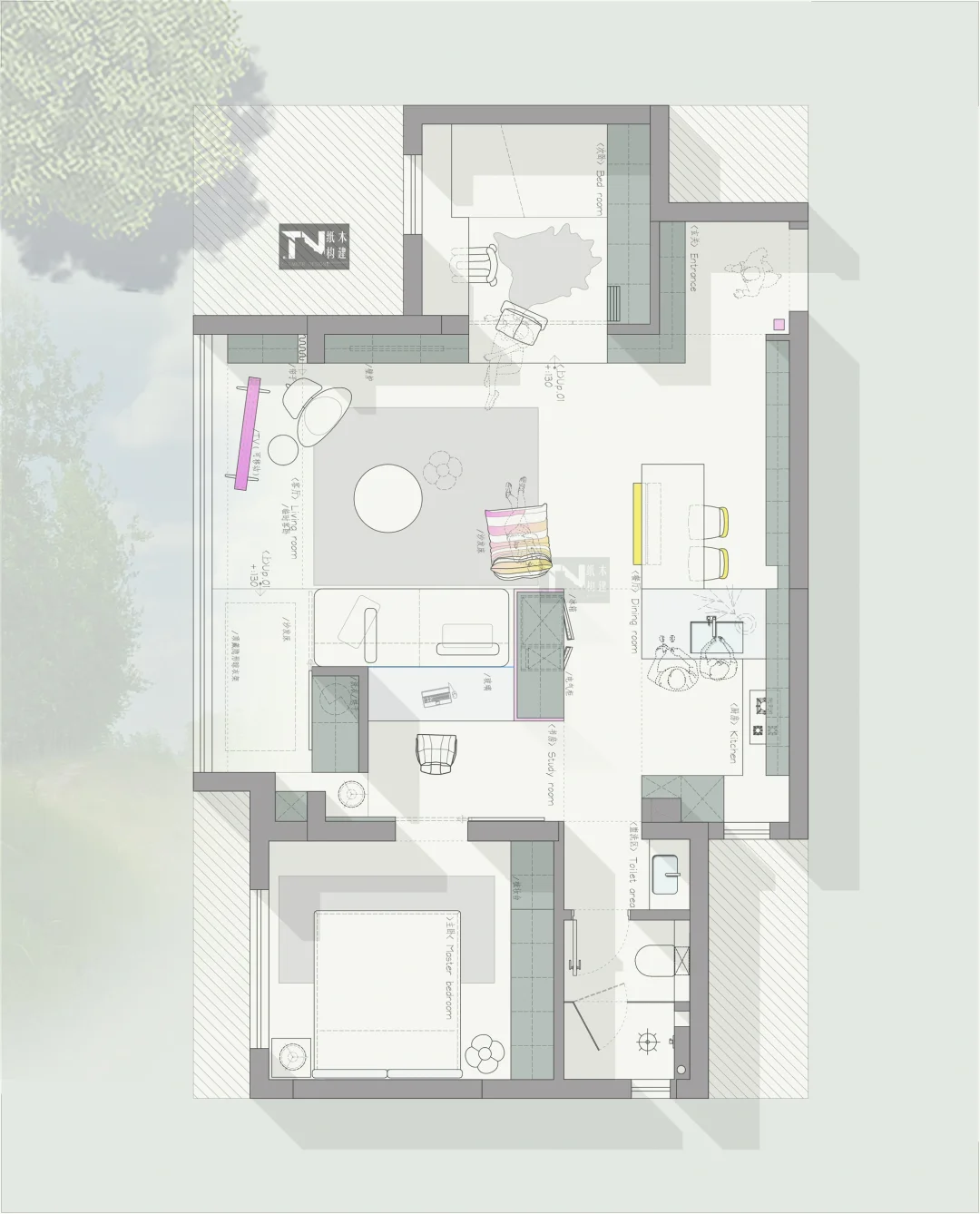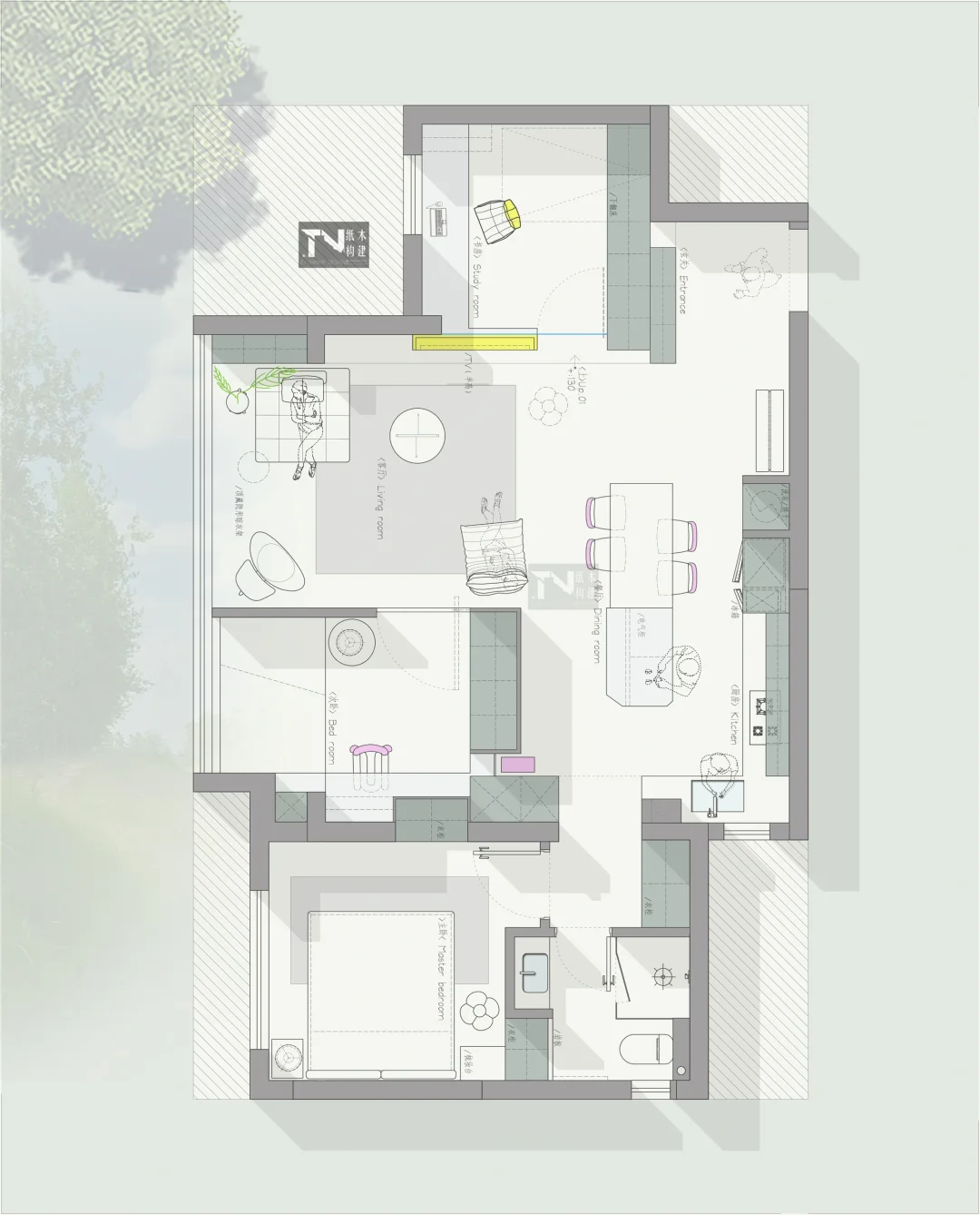 设计需求: 精装房,感觉什么空间都小 1、一家三口 2、主卧、次卧、一个小书房 3、打开厨房,还想要岛台 4、看能不能做大客厅,客厅太小了