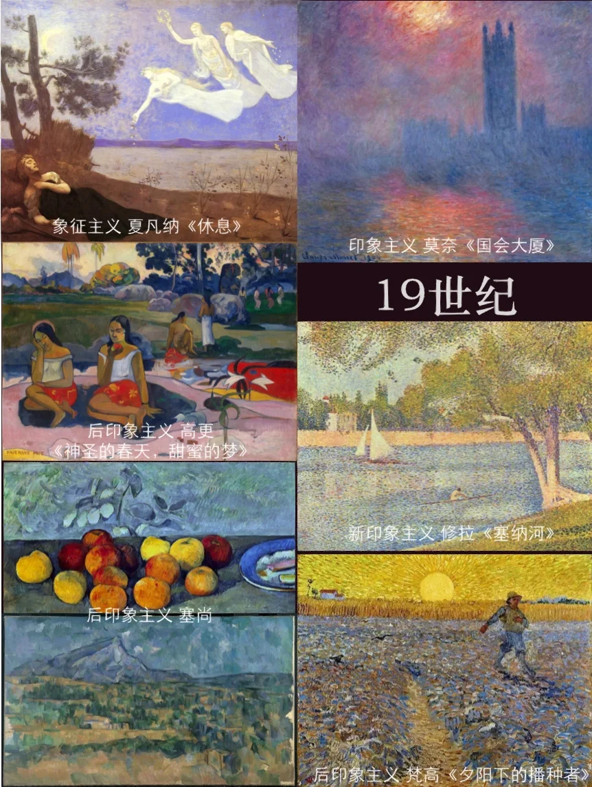 -夏凡纳在虚幻梦想中展示寓意;莫奈在光影流动中捕捉色彩;修拉在线条消弭中实践点画;