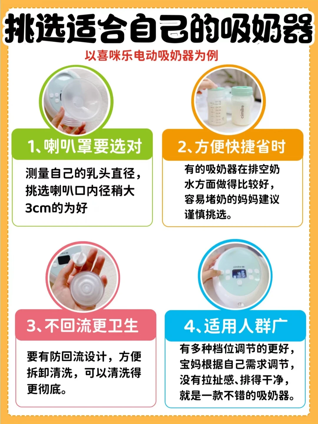 我产前准备的是手动吸奶器,但是产后用来下来真的太废手了,在做过吸奶器功课后,决定选择了喜咪乐双边电动吸奶器,吸奶快效率高,一天吸3次奶也没有拉扯的感觉,尤其是夜里可以开LED小夜灯,吸奶特方便,奶水也排的干净~真心建议容易堵奶的妈妈考虑这款。最主要是双变频功能,出奶阵很容易,30秒就能刺激出来!