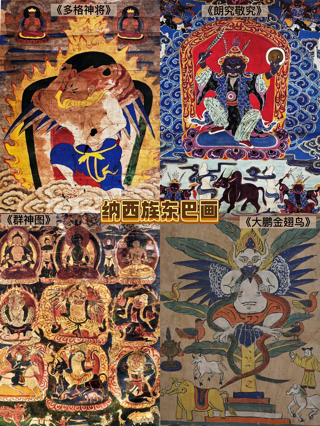 🖼同样源自少数民族的纳西族东巴画相比唐卡的精美繁复,显得简略粗犷,质朴率真,尤其对鬼怪的刻画,夸张生动,充满了泥土气息。