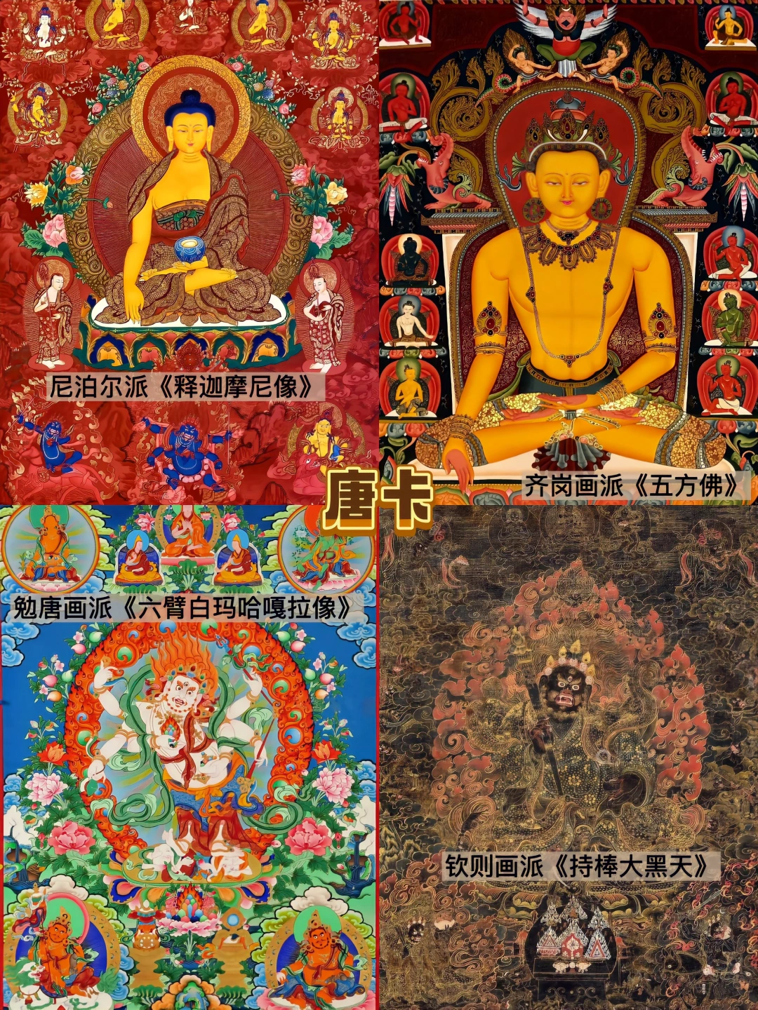 🎨首先是唐卡,作为藏族特色绘画,它分为尼泊尔画派、齐岗画派、勉唐画派、钦则画派、噶玛嘎孜画派、新勉画派,因为颜料包含金银、玛瑙、孔雀石、藏红花等珍贵物质,故能历经百年而光彩夺目。