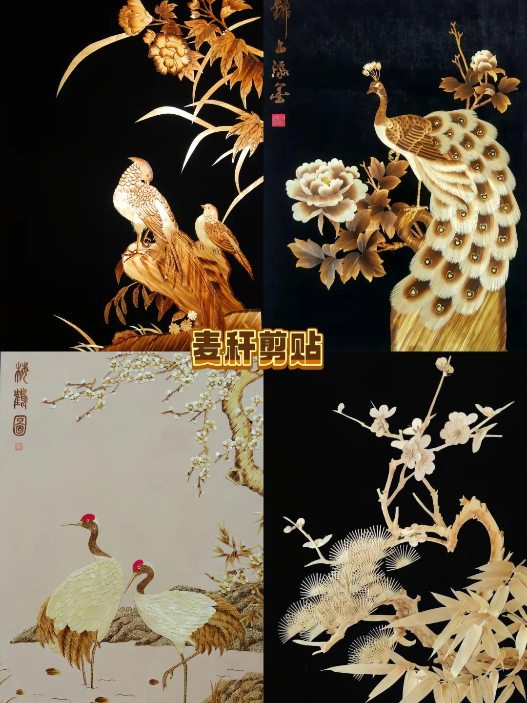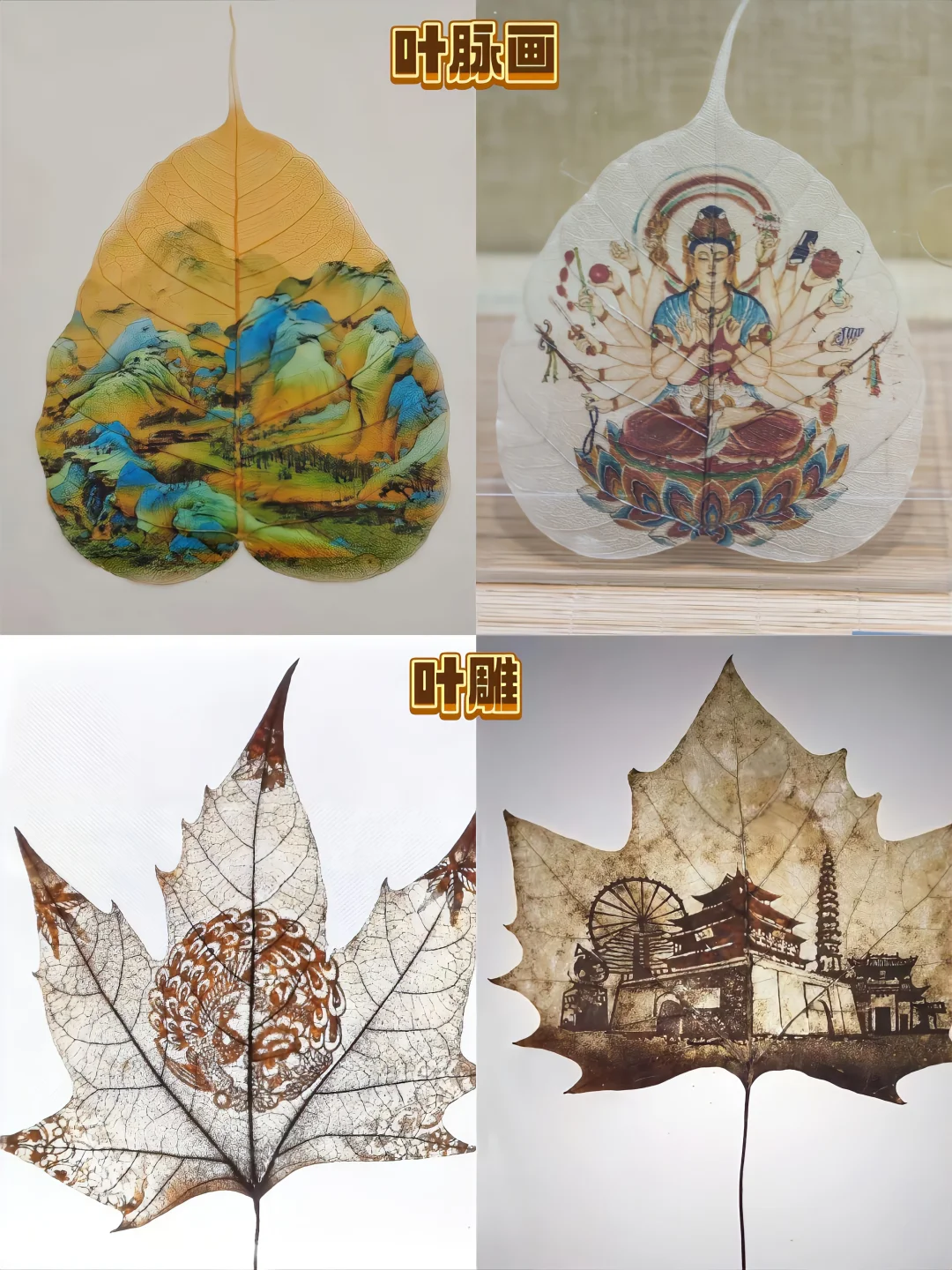 🍁当然,民间艺术离不开自然。麦秆剪贴在突出天然质感的同时,呈现出中式美学的诗、书、印、画;叶脉画以独特工艺去除叶肉,展示轻薄纤细与传统艺术的完美融合;叶雕历经了60多道工序,集合版画、微雕、剪纸技术,显露出叶黄而不脆,筋弯而不断之妙。
