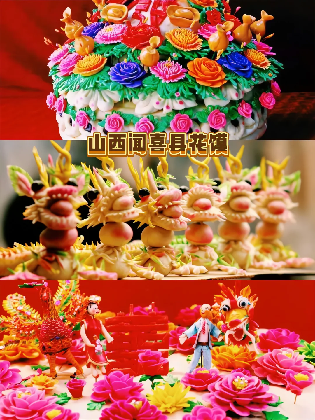 🥞山西闻喜县花馍也主打好看好吃,它不仅色彩丰富,造型百变,而且是婚嫁、寿诞不可或缺之景,真正印证了“有事必有馍,有馍必成事”。