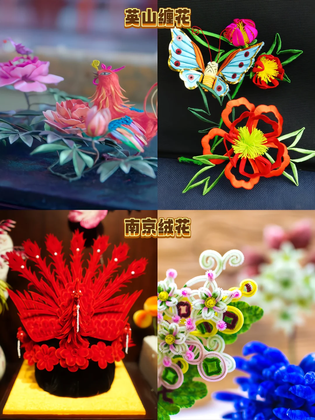 💐人们对花的创作,也毫不吝啬。北京绢花用各色丝织品仿制花卉,将春、夏、秋、冬永久留存;湖北英山缠花用多彩丝线缠绕坯架,制作鸟、兽、虫、鱼、花、果寓意吉祥;南京绒花由蚕丝、铜丝为原料,产出各类装饰:鬓头花、胸花、帽花、罩花等等,极具民间特色。