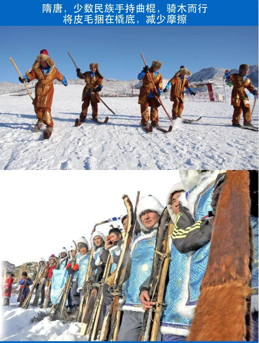 ⛷隋唐时代,多有文书记载,东北女真族手持曲棍,骑木而行;室韦族将皮毛捆在橇底,减少摩擦;蒙古族、回鹘族脚踩木马,冰面飞驰。