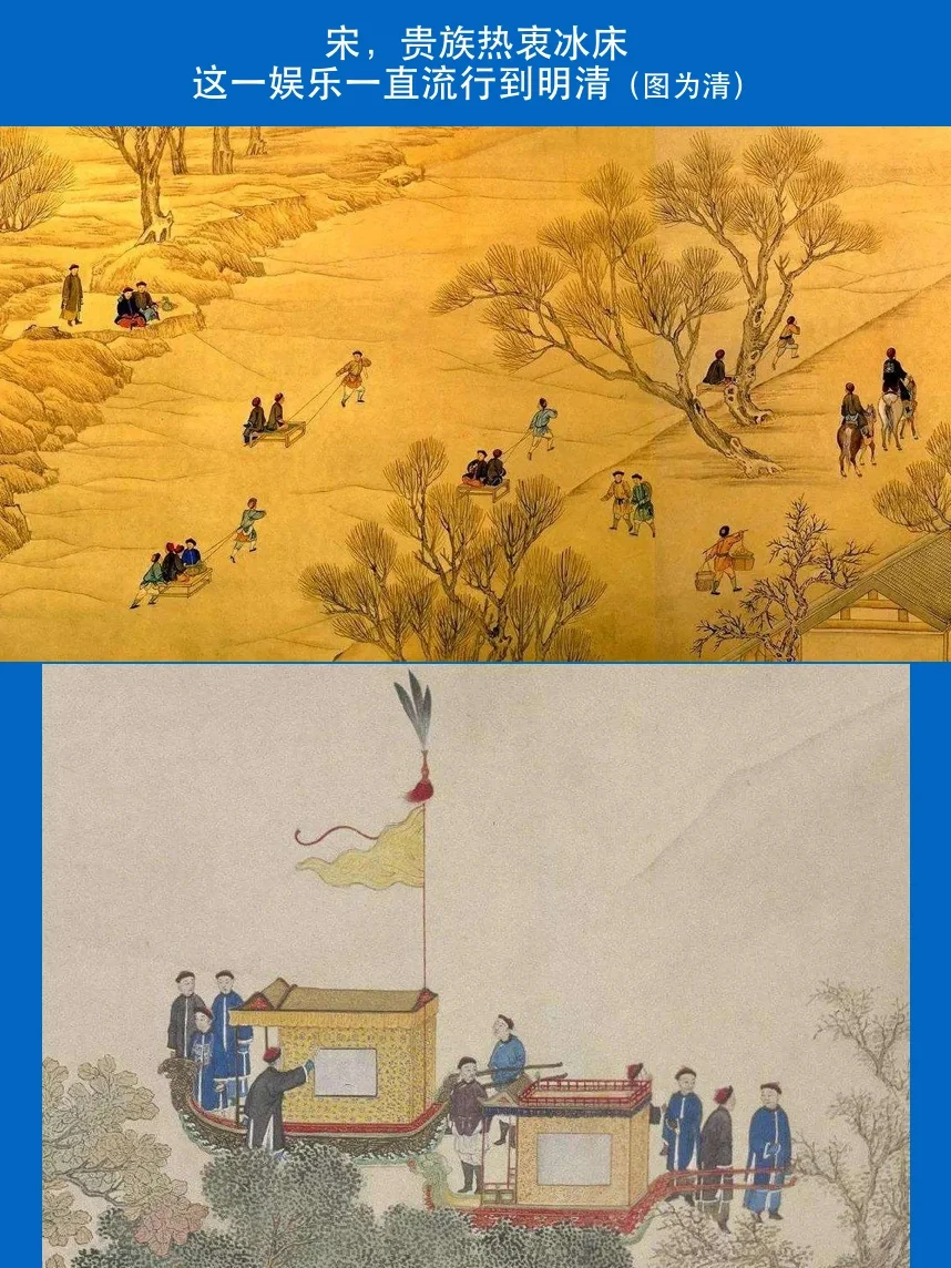 🛏贵族子弟热衷冰床,这是一种把木板盖上被褥,再由人力拉动在冰上滑的娱乐。他们常将十几张床连在一块儿,躺在上面饮酒作诗。