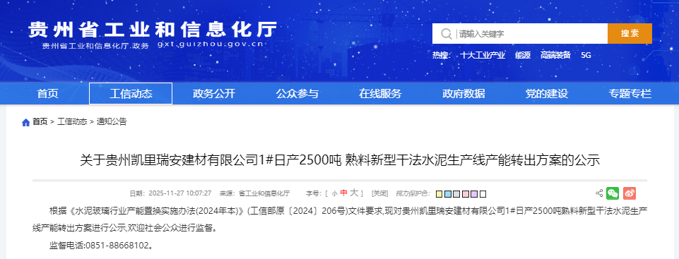 11月27日,贵州省工信厅发布“关于贵州凯里瑞安建材有限公司1#日产2500吨熟料新型干法水泥生产线产能转出方案的公示”。