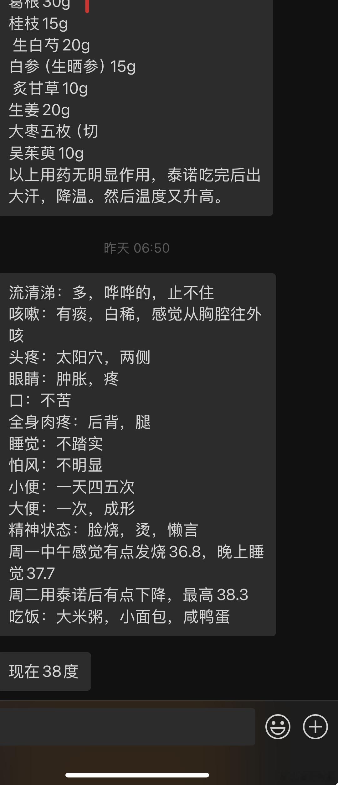 【很有意思的一个退烧医案】昨天的事情,一个老病人说,她老公发烧了,已经3天了,吃了中成药、中药,还有奥司他韦,也不管用。每天发烧的热度不是很高,38的样子,吃了泰诺退烧药,出汗了,烧退了,然后又再次发烧。清鼻涕,咳嗽,痰多,全身疼等,困倦,一看舌苔,明白了,这是水气病。什么方子呢?桂枝去桂加茯苓白术汤原方。吃了一副药,今天反馈就退烧了。经方真是很神奇!当然,这一招还是向李老师学习的,李老师一副药,不管是病毒,还是细菌,都退烧如神,值得我们好好学习。