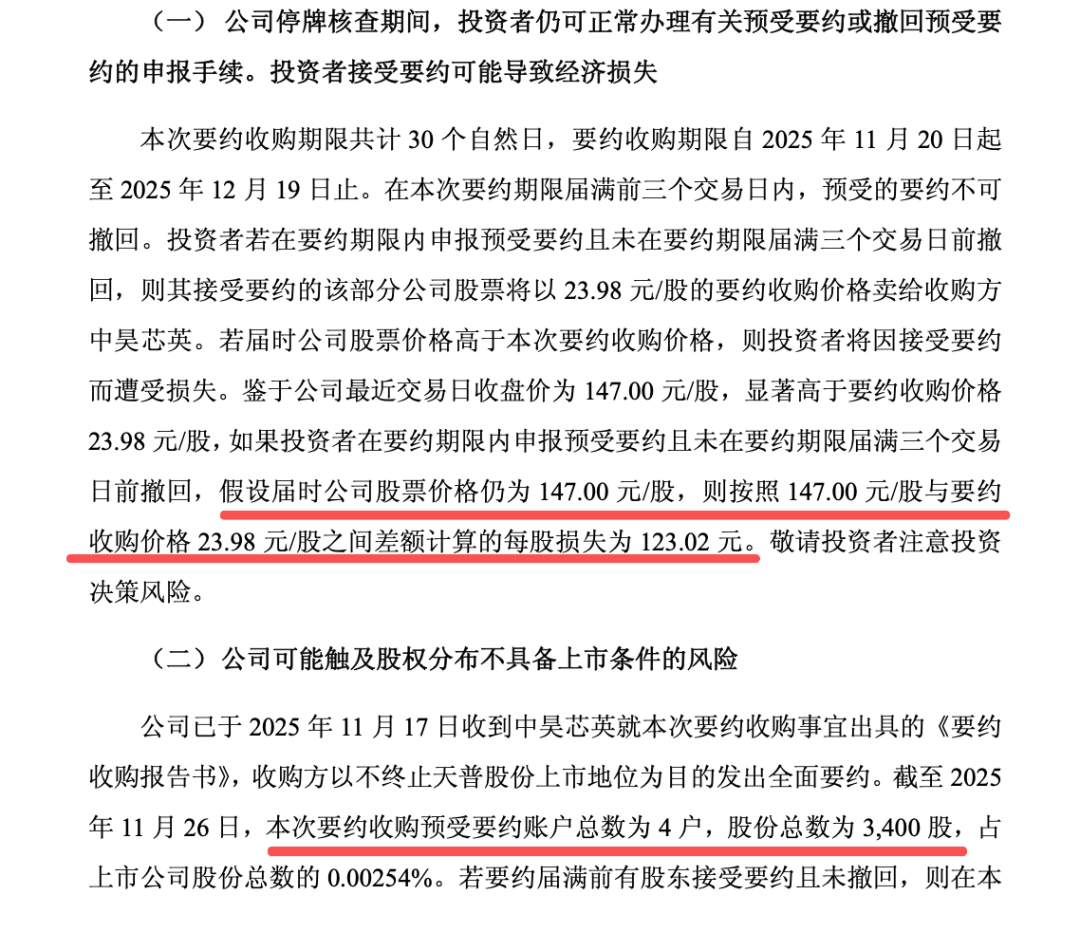 值得注意的是,中昊芯英对天普股份股东提出的要约正在推进中,不受停牌核查影响,本次要约将到12月19日止。目前本次要约收购预受要约账户总数为4户,股份总数为3400股。天普股份提示,鉴于公司最近交易日收盘价为147.00元/股,显著高于要约收购价格23.98元/股,如果投资者接受要约需承受每股损失123.02元。