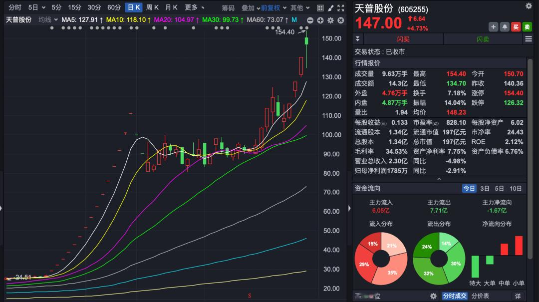 交易数据显示,天普股份当下的交易资金较为分散。11月25日至26日,天普股份二连涨停,其间累计成交近12亿元,但是龙虎榜上买方前五席位合计净买入金额也仅5717.64万元。