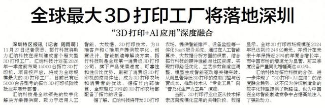 11月27日记者获悉,拓竹科技将助力汇纳科技在深圳建成首个超大型3D打印工厂。汇纳科技计划在2026年一季度前布局15000台拓竹3D打印机,项目投产后,将成为全球规模最大的3D打印工厂。目前已有近5000台各型号的拓竹3D打印机陆续抵达并展开部署。