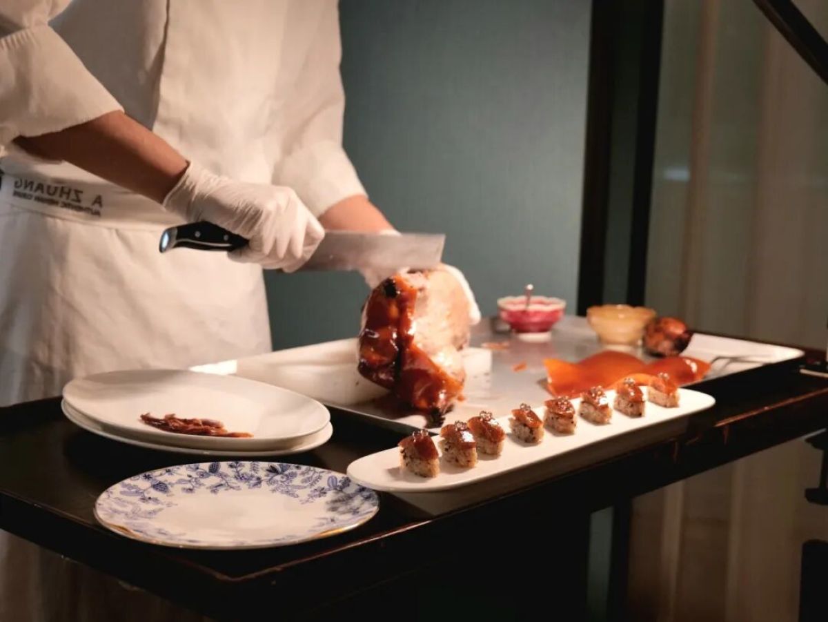 随后的品鉴宴上,阿庄厨房团队精心呈现了多道新豫菜代表作,让代表团沉浸式感受豫菜的魅力。作为阿庄头牌菜的酥香嫩烤鸭,现烤现片后皮脆肉嫩,还带着浓郁枣香;陈氏红烧黄河大鲤鱼更是豫菜泰斗陈进长大师从艺63年的经典之作,活鱼现杀后用高汤烧制40分钟,骨香肉嫩、原汁原味;豫菜经典葱扒羊肉则以熟制肥肋条肉搭配炸黄葱段,文火慢扒至汁浓,软香适口且醇厚绵长。品鉴过程中,马来西亚同行围绕烹饪技艺、食材选择与口味创新等话题,与庄哥深入交流,对阿庄“守正创新”的豫菜发展理念给予高度认可,“这完全刷新了我们对豫菜的认知,既有文化根脉,又有国际表达。”一位代表团成员说道。