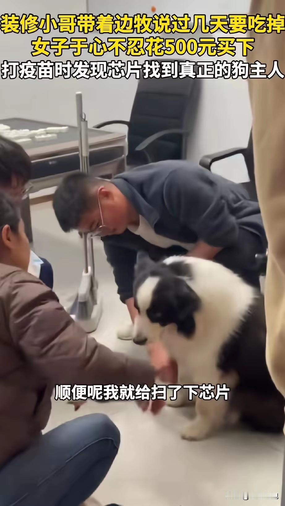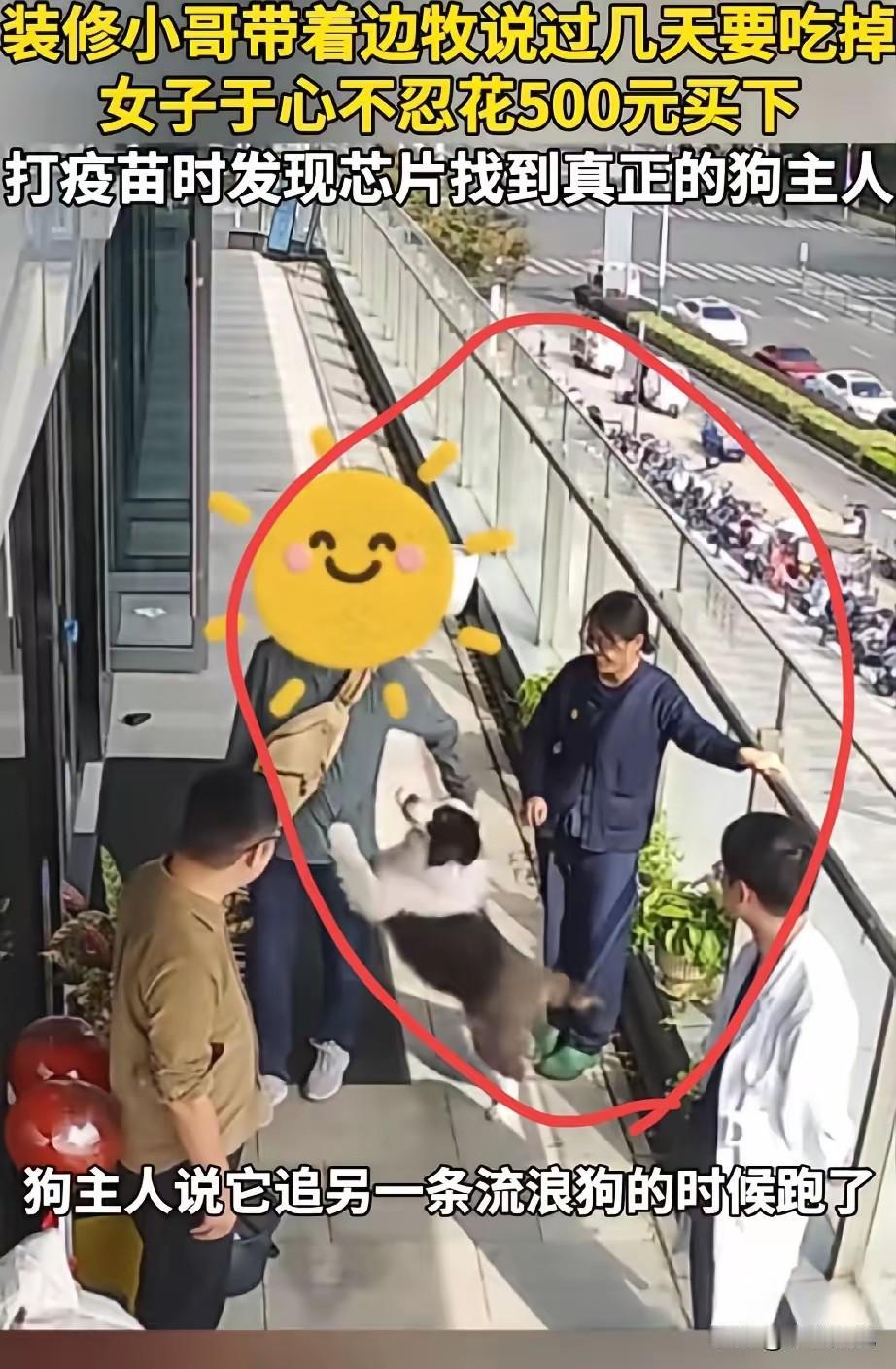 苏州,女子路过一家正在装修的店铺,发现门口拴着一只边牧,它正用可怜巴巴的眼神望着自己。女子好奇地问装修工:“工作还带着狗呀?”装修工人回应道:“这狗不想养了,等会儿杀了吃肉。” 11月25日,苏州仇女士在接受采访时说,当时她下楼吃饭,听见这话心里一咯噔。她没多想,直接掏了500块钱把狗买了下来,她觉得不管这狗是谁的,先保住命再说。 买下狗后,仇女士带它去打疫苗,医生扫出狗身上有芯片,查出来原主人的联系方式。打过去电话,原主人当场哭了,说这狗是半年前在公园丢的,全家找了三个月,寻狗启事贴了半条街,早以为找不回来了。 当天下午,原主人赶来把狗接走,抱着狗的手一直在抖。仇女士说,看着狗在原主人怀里摇尾巴,她知道这500块花得值。 这事传开后,不少人说仇女士做了件好事,也有人质疑装修工人:这狗明显是别人丢的,他凭啥要杀了吃肉?还有养宠人说,给宠物装芯片真有用,不然这狗可能真回不了家。 其实这事里,最该说的是“底线” 不管是不是自己的狗,都不能随便决定它的生死;而仇女士的“不忍心”,刚好守住了这份底线。500块不多,但能把一条命从刀下拉回来,还能让一个家庭找回牵挂,这就是善意的力量。 现在这只边牧已经回到原主人身边,每天能跟着主人去公园散步,再也不用被拴在装修店门口担惊受怕。 各位读者你们怎么看?欢迎在评论区讨论。