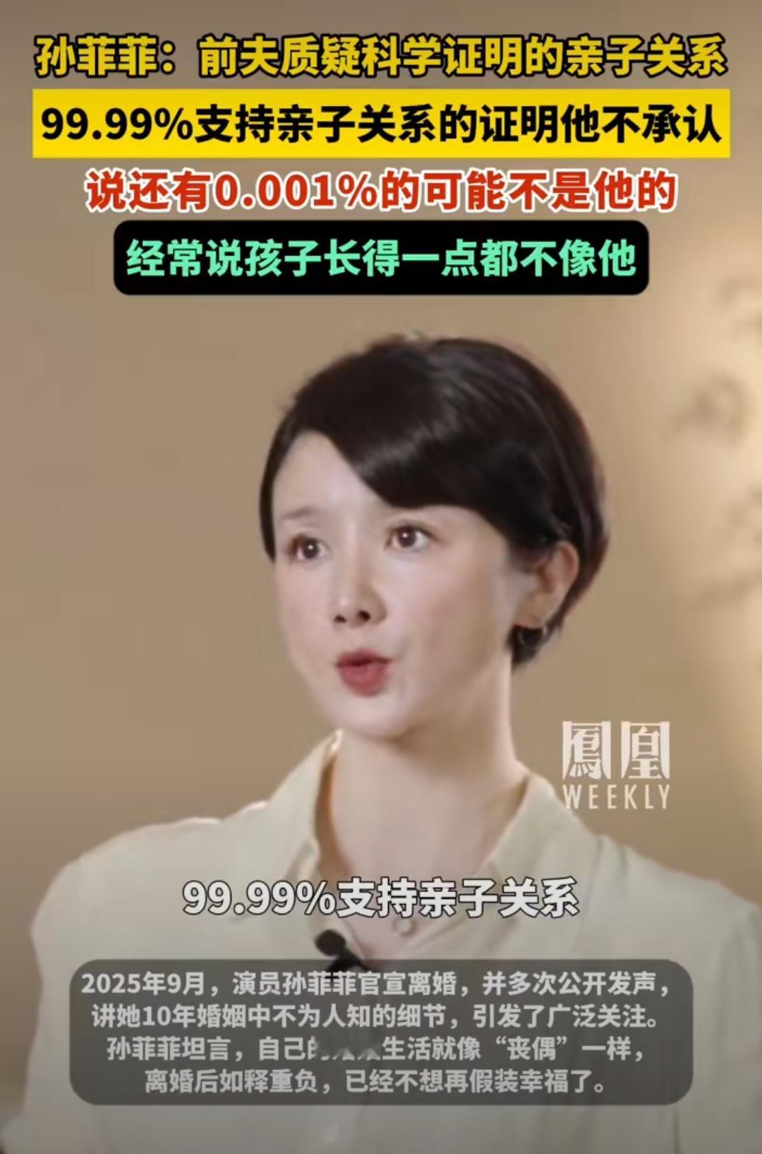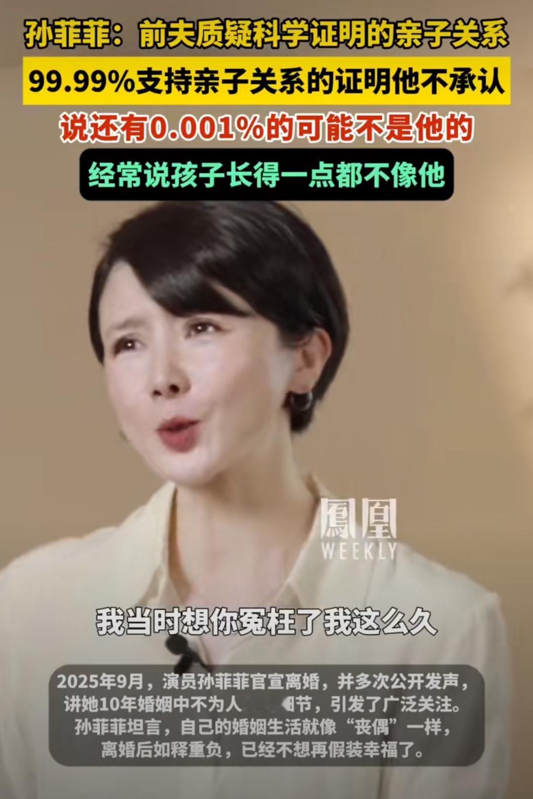 谁懂啊家人们,心疼孙菲菲到拳头硬邦邦!十年婚姻简直是渡劫,怀孕时连粒葡萄干都没被前夫史宏买过,养家全靠她,还遭冷暴力和无端猜忌,逼得做了亲子鉴定,99.99%的亲生结论摆眼前,这位化学硕士前夫竟死揪0.001%抬杠,纯纯揣着明白装糊涂。更绝的是离婚拉锯两年、起诉四次才解脱,前夫一边拒付抚养费,一边还假惺惺念着孩子。按这奇葩思路,真想拽着他跟他爸也做个鉴定,看看是不是也剩0.001%的意外,离谱到没边儿,心疼孙菲菲终于熬出头!