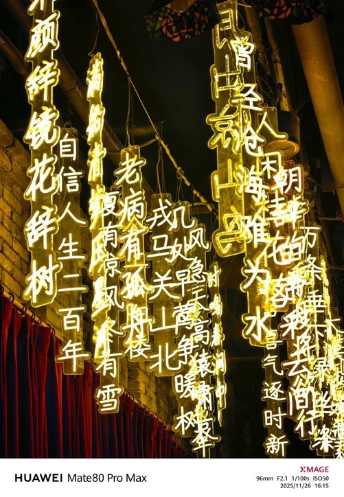 在暗光条件下的玻璃橱窗,华为Mate80ProMax的画质把摆件纹理、书本纸张质感都拍得很清晰,连灯泡的光晕也柔和不刺眼,玻璃橱窗内部的细节也不会被涂抹掉。这背后就是像素级LocalAWB和三维色域映射的功劳,可以让画面接近肉眼真实所见。