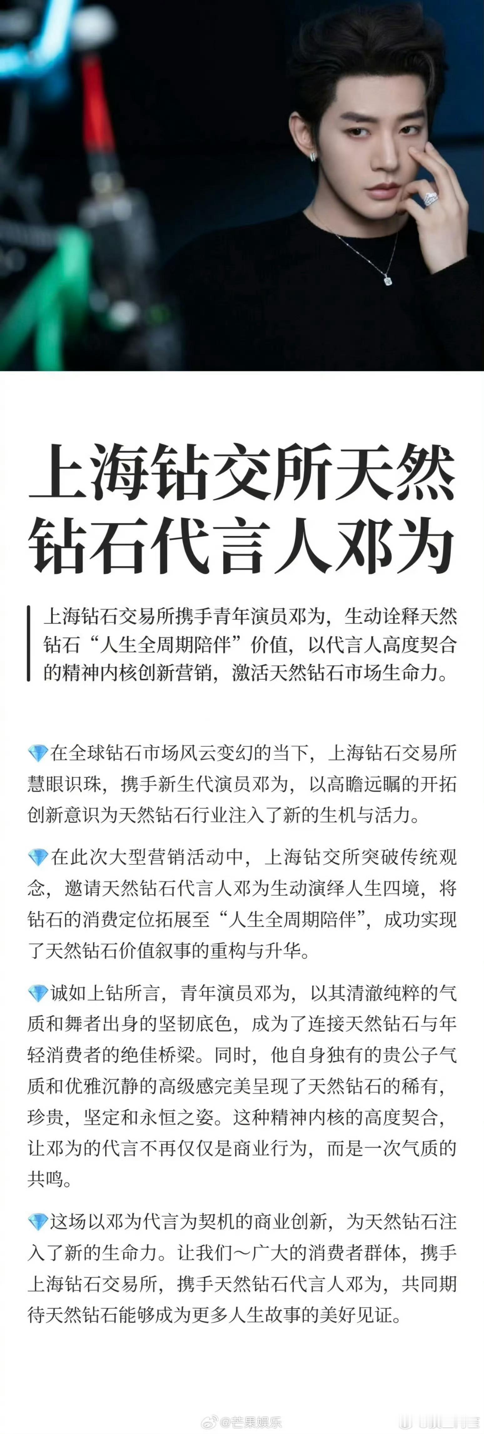 邓为代言上海钻石交易所天然钻石官方战报,代言官宣后天然钻石获114.7亿曝光量,