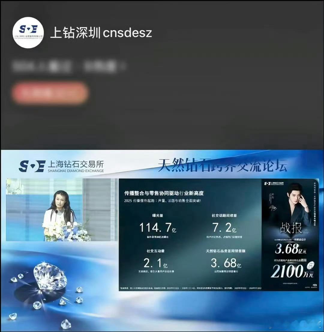 邓为代言上海钻石交易所天然钻石官方战报,代言官宣后天然钻石获114.7亿曝光量,话题阅读量7.2亿,互动量2.1亿,总销售3.68亿元