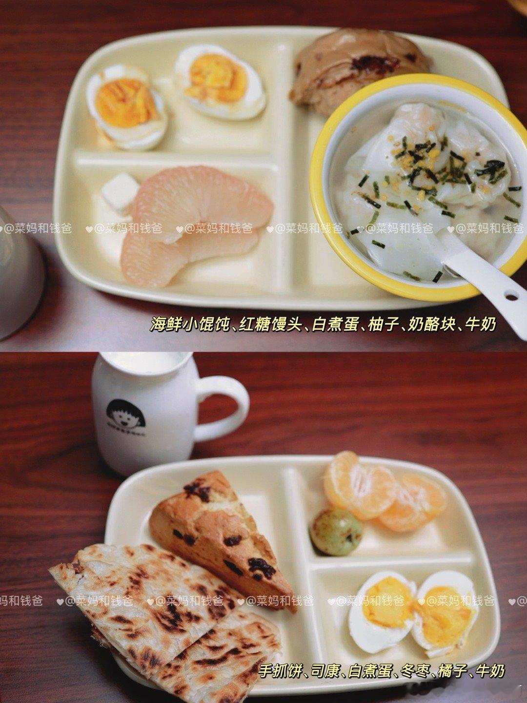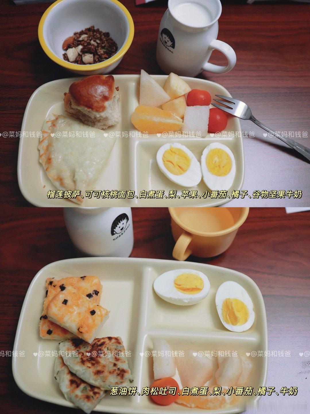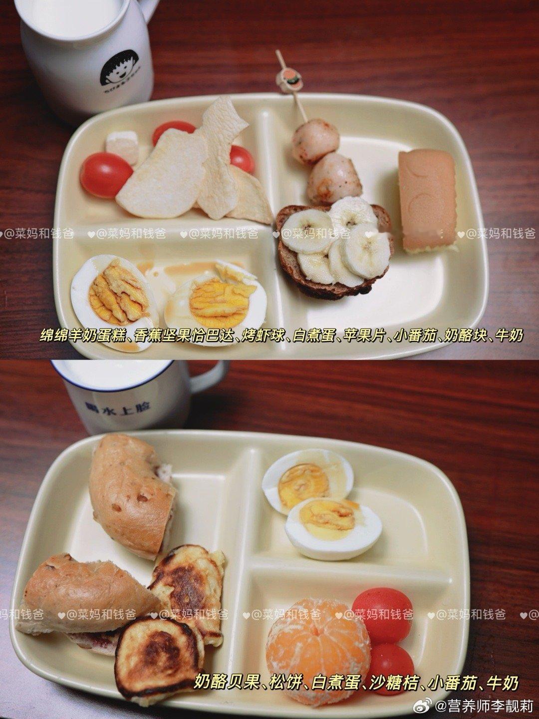 这3种早餐,别再吃了!❌牛奶+鸡蛋(蛋白+蛋白)错误原因:蛋白质双重叠加,热量虽足但缺碳水“燃料”,孩子上课上容易血糖不稳,注意力散。✅加一片全麦面包或一碗燕麦粥,来几颗坚果就好很多啦。❌果汁+面包圈(高碳低纤维)错误原因:糖分双剑合璧,精制碳水消化快,也容易很快就饿了。✅换成新鲜橙子切片+烤全面面包块+奶酪片+牛奶,满分早餐,轻松Get!❌白粥+大饼/油条(碳水+碳水)错误原因:双碳水轰炸,粥和大饼/油条都精制谷物,缺蛋白+蔬果缓冲,血糖快速升降如过山车,上午课上易犯困。✅加个鸡蛋,粥里来点芹菜末,搭配点肉松,配上一杯牛奶,孩子稳稳一上午!✨🥰【早餐公式】:主食+蛋白质(如鸡蛋)+奶豆类+蔬果🏵️均衡营养的早餐,应包括以下4类食物中的3类及以上:🥢谷薯类:如馒头、花卷、全麦面包、面条、米饭、米线、红薯、土豆。🥢动物性食物:鱼禽肉蛋等,如鸡蛋、鱼、虾、鸡肉、猪肉、牛肉。🥢蔬菜水果:如菠菜、西红柿、黄瓜等;桃、荔枝、梨、香蕉、车厘子等。🥢奶豆坚果:如牛奶、酸奶、奶酪;豆浆、豆腐脑、豆腐干等;坚果如核桃、榛子等。——————本月的早餐里,✨增加了一些汤汤水水热乎乎的早餐,如海鲜小馄饨、莜面鱼鱼;✨有一些比较有锅气的小时候的早餐,如葱油饼、手抓饼、披萨等;✨水果种类看起来很多,但每天的量其实并不多,增加了早餐的食材种类和兴趣。❇️🥰欢迎大家参考~健闻登顶计划全民营养提升计划 萌娃养成记带娃日常