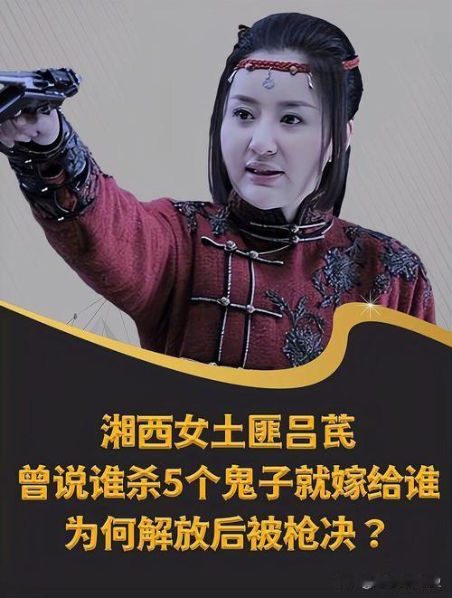 湘西女匪首吕芪:拿鬼子人头当聘礼的乱世奇女子 1943年,湘西古城。18岁的吕芪与姐妹进城,却遭日军凌辱,姐妹惨死。她装死逃过一劫,在尸堆中立下血誓:“谁杀一个鬼子,我陪他一夜!谁斩五个鬼子,我嫁他为妻!” 此誓一出,震动湘西。 两年后,57岁的土匪头子杨武,派人提来六颗血淋淋的鬼子人头,扔在她面前。19岁的吕芪二话不说,兑现诺言,披上嫁衣,成了压寨夫人。 她并非柔弱女子。入寨后助夫整饬队伍,瓦解叛乱,亲手击毙叛徒,很快成为湘西地面令人闻风丧胆的实际掌权者。 然而,乱世洪流中,她的故事结局令人唏嘘。1952年,因对抗新政、杀害无辜,这位曾立志复仇的奇女子被依法处决,年仅27岁。 她既是日寇暴行的受害者,也是为祸一方的匪首。吕芪的一生,是那个黑暗年代的悲剧缩影。您如何评价她?欢迎在评论区留下您的看法。双枪女土匪 湘西土匪