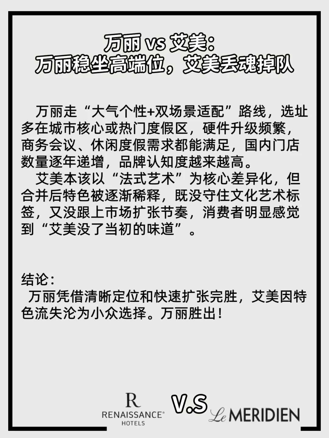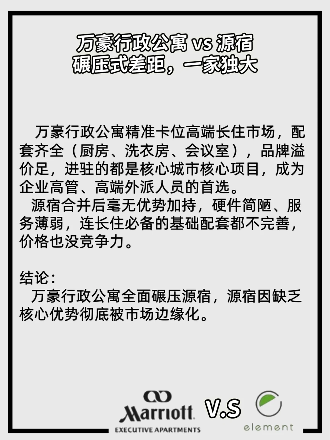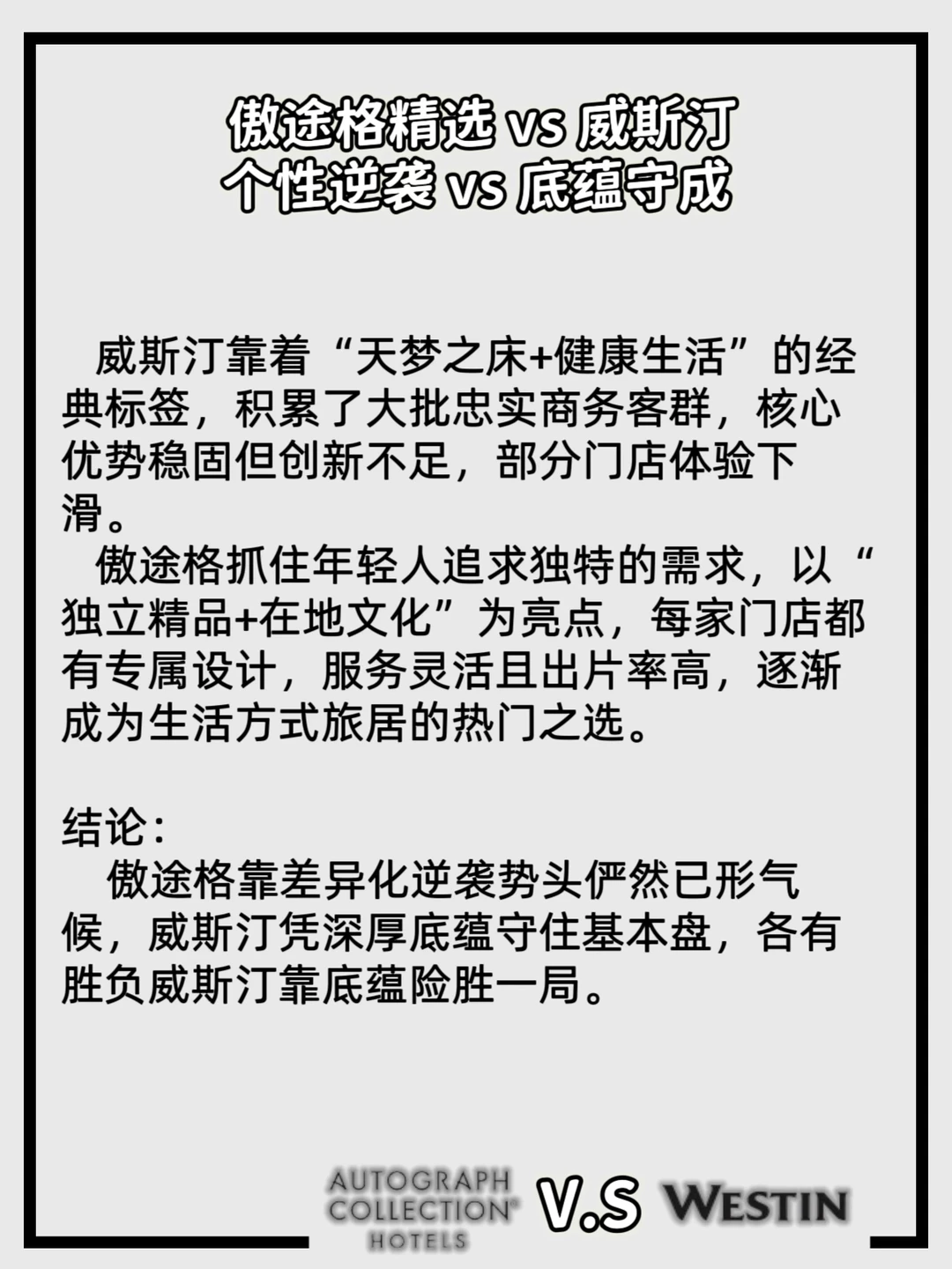 2016年万豪收购喜达屋的“世纪联姻”,直接让同档位品牌开启“同门互卷”模式。 十年过去,三组核心对手的厮杀落下帷幕,每组结局都藏着市场的选择👇 1️⃣高端品牌一组:万丽和艾麦的正面PK; 2️⃣高端品牌二组:傲途格和威斯汀的客户群高度重叠; 3️⃣长住品牌组:万豪行政公寓和源宿主打高端长住市场,配套齐全(厨房、洗衣房、会议室),他们对决的结局又会怎样? 要是同台pk、捉对厮杀的话,这三组对手战绩如何呢?