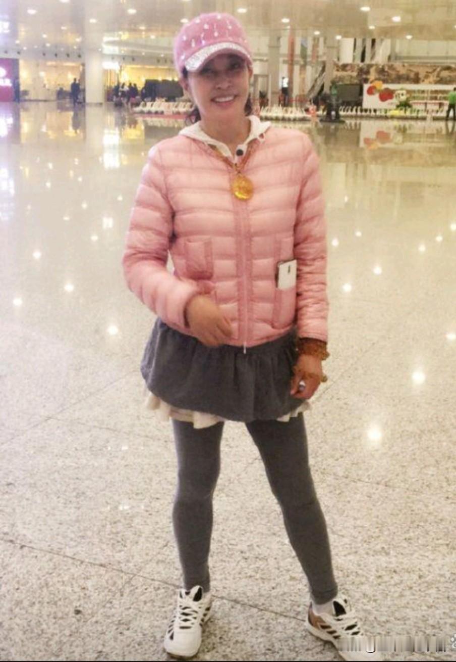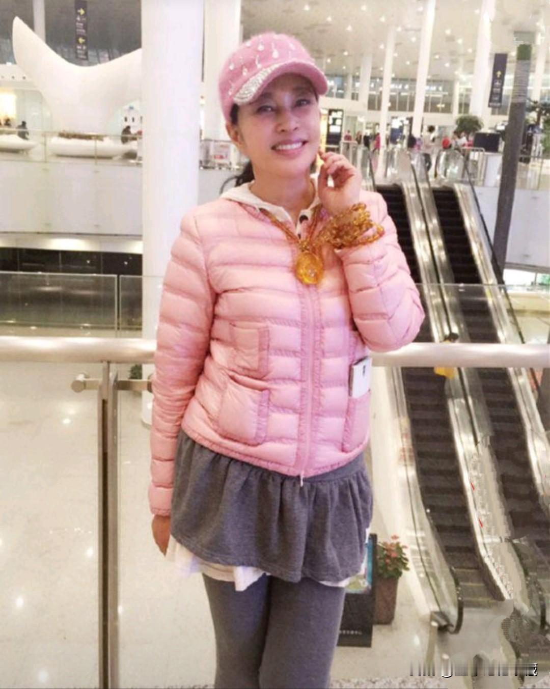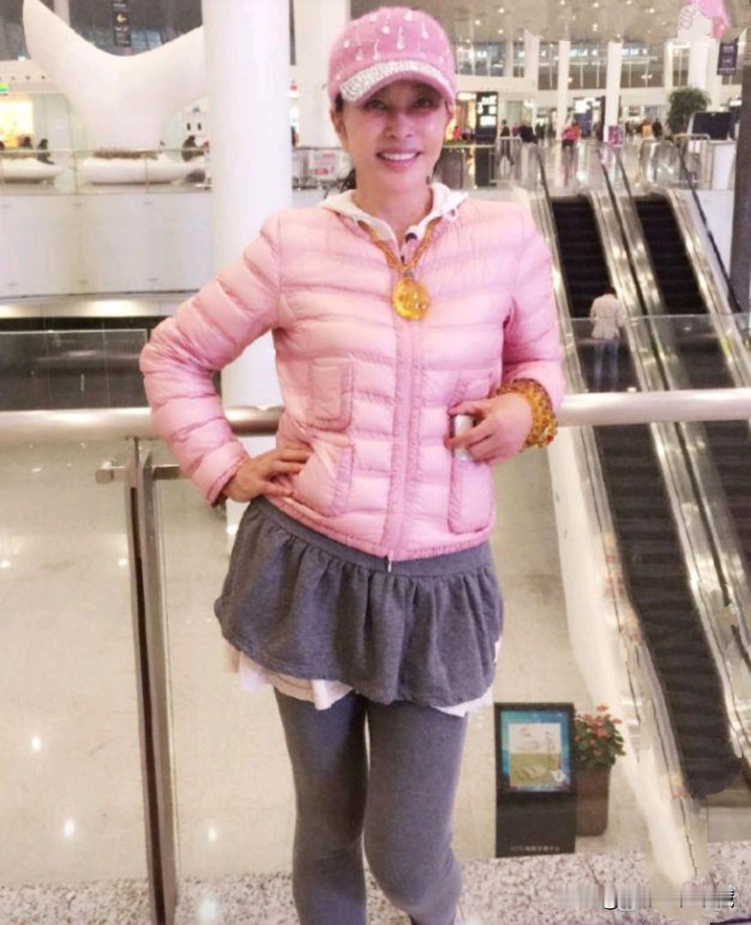 75岁刘晓庆阿姨穿粉色游商场,刘晓庆真的太少女了,一把年纪都敢穿粉丝羽绒服,戴着