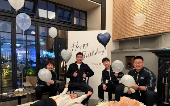 国乒教练邱贻可在社交网站晒出自己的生日合照,照片中孙颖莎、蒯曼拿着气球,并配文: