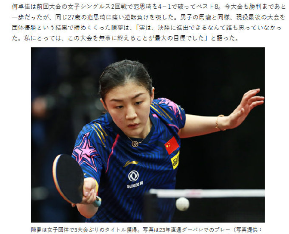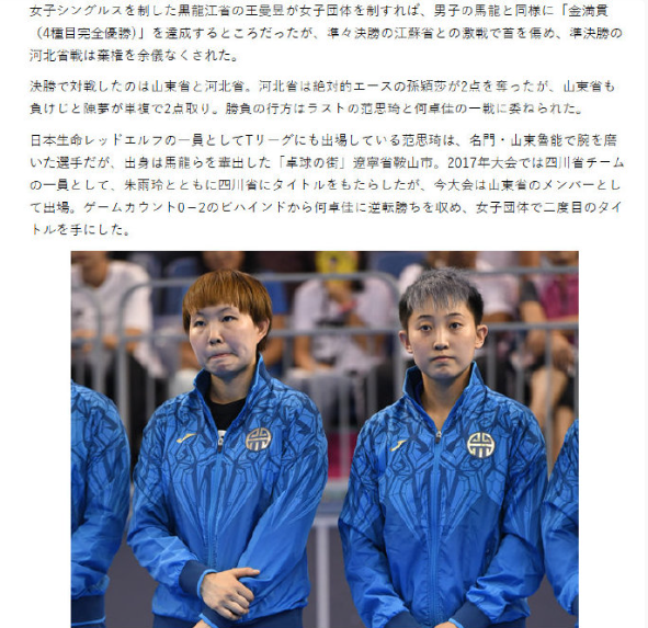 日媒报道陈梦带队夺全运女团冠军,山东省在全运动会女子团体赛中获得冠军,两届奥运冠军陈梦表现出色。