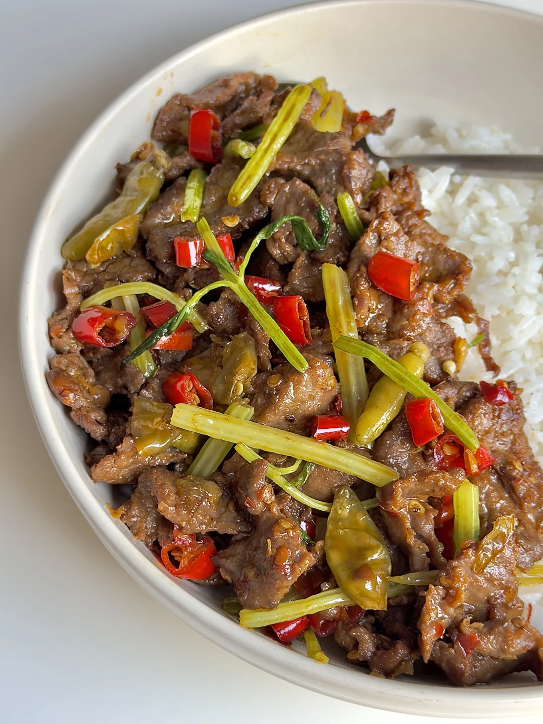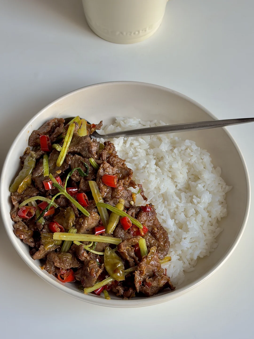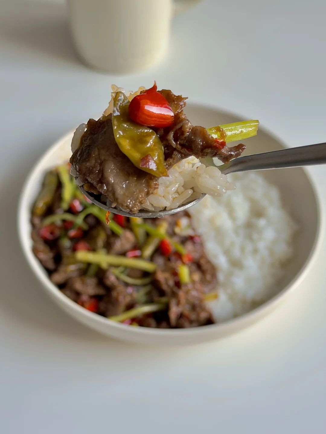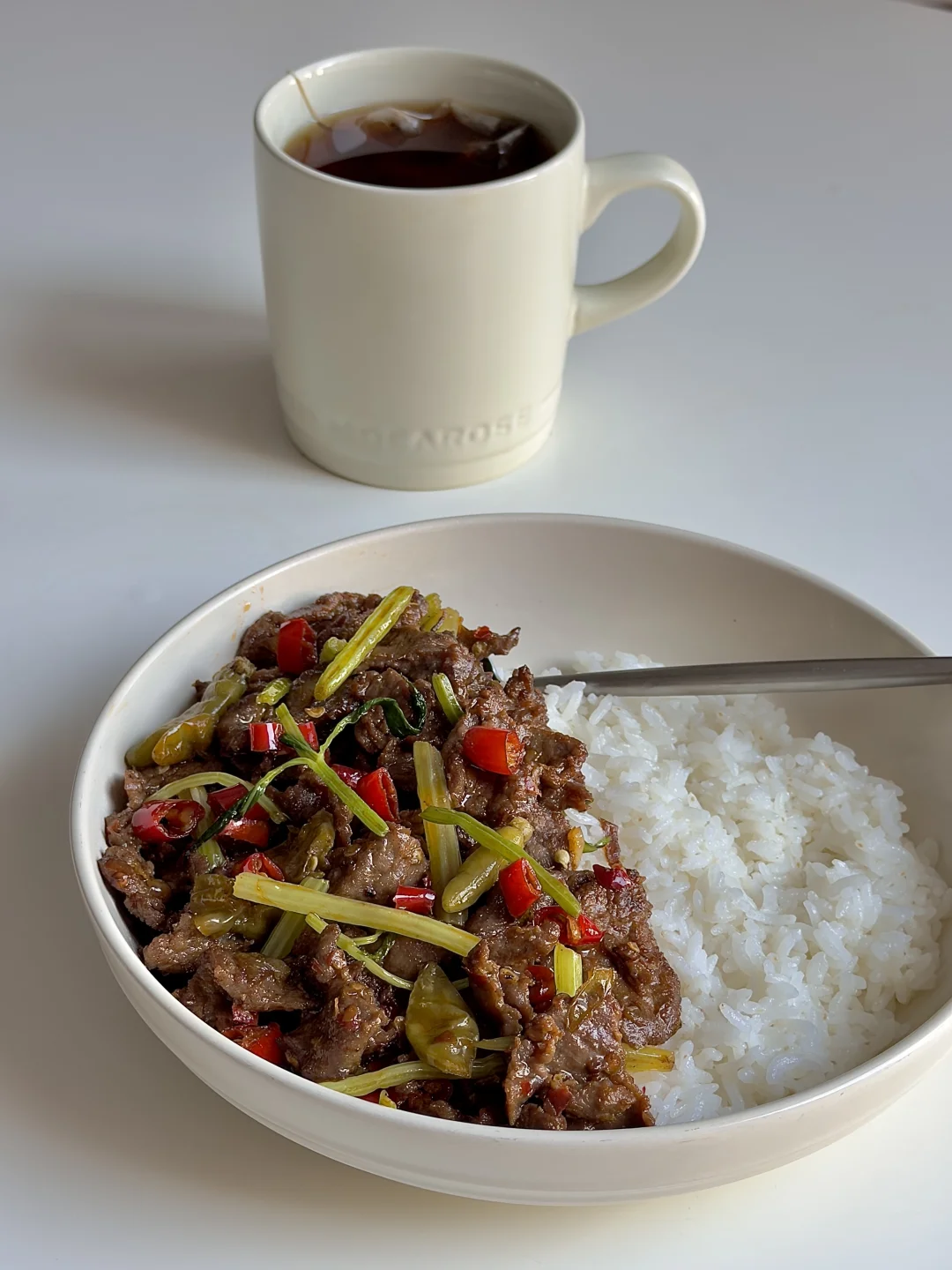 今日份一人食健康午餐分享: 泡椒牛肉盖饭 一杯红茶☕️ . 食材:牛肉 泡椒 小米辣 芹菜 蒜末 做法如图上⬆️ . 最近特别迷恋泡椒味的东西 这个泡椒牛肉真的巨好吃 我里面还放了泡椒酱 真的太下饭了😋