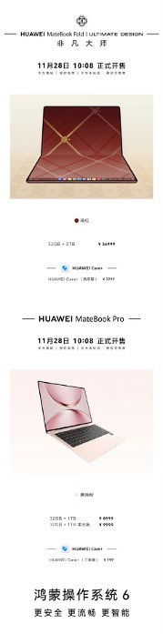 售价方面,全新配色华为MateBookFold非凡大师瑞红32GB/2TB版售价26999元;华为MateBookPro拂晓粉32GB/1TB版本售价为8999元,32GB/1TB柔光版售价9999元。