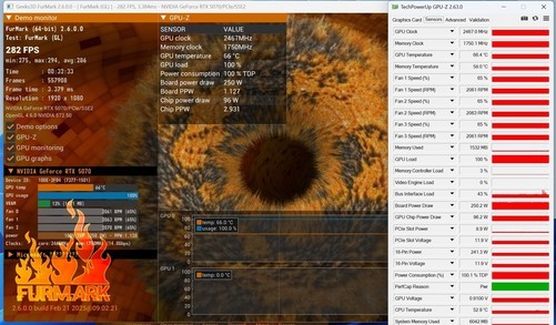 散热方面,iGameGeForceRTX5070UltraWOC12GB采用了三风扇设计,配备6根6mm热管和大面积散热鳍片,使用回流焊工艺确保高效导热。长时间烤机测试中,显卡温度大约为66度,散热效果出色。