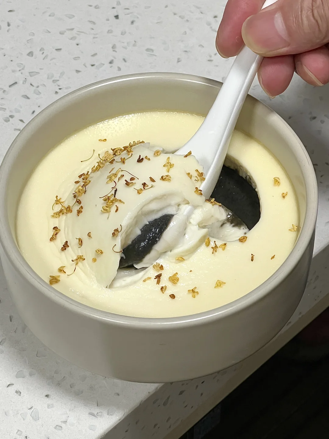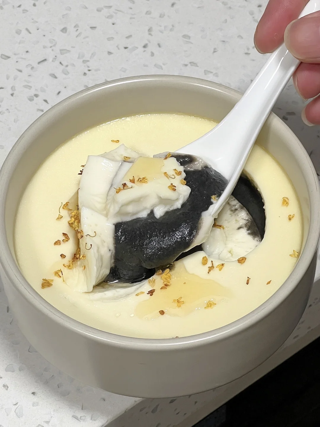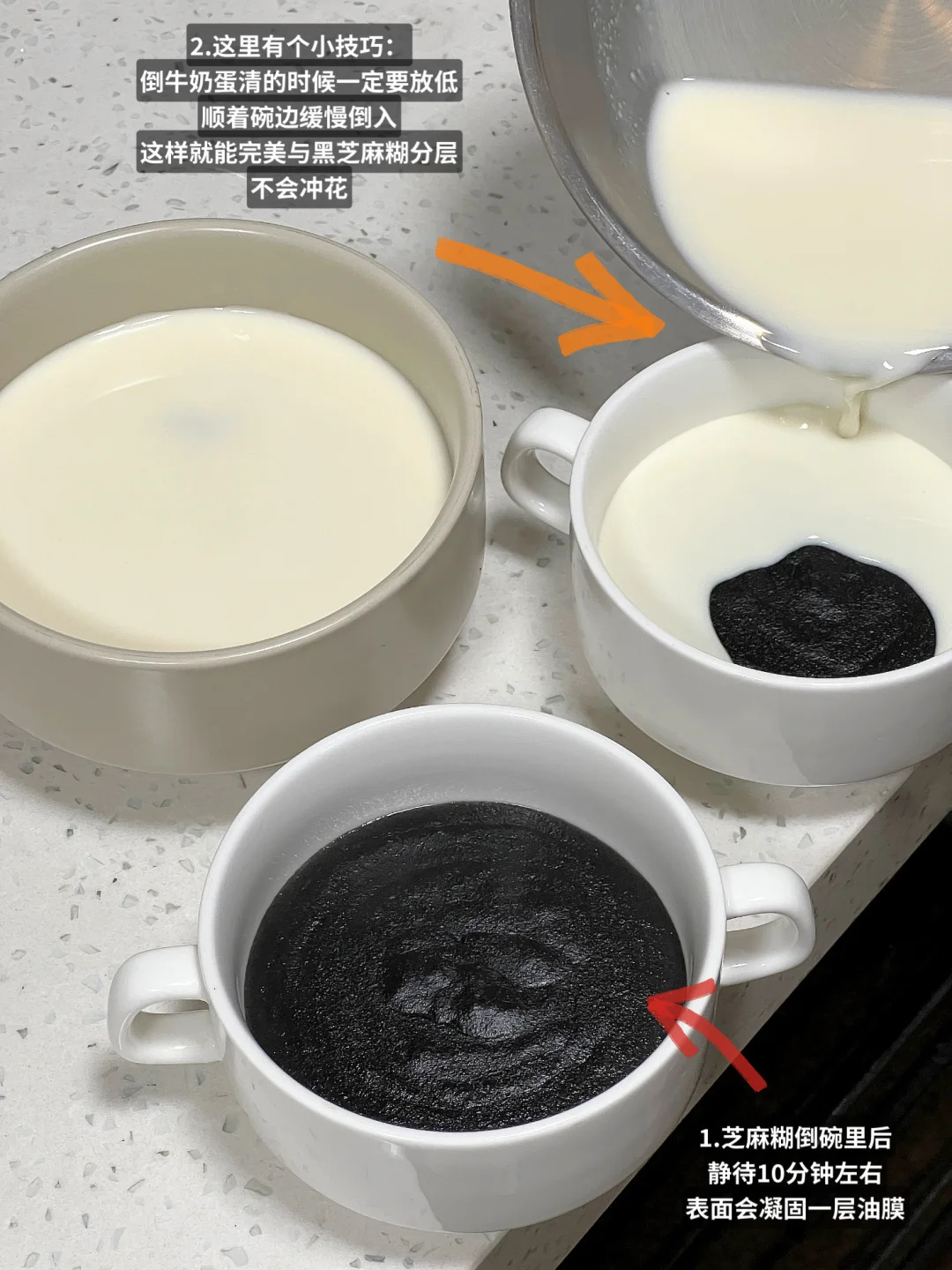 这几天我的小被铺天盖地的黑芝麻糊炖奶入侵了[呃R] 一向不怎么喜爱甜品的我,也忍不住喊男朋友做来试试。等蒸好后,迫不及待尝了一口,接着第二口第三口…吃的停不下来🤣 果然火起来不是没有道理的[暗中观察R] 上层嫩滑的炖奶,下层香醇的黑芝麻糊,一勺下去,不管在味道上还是口感上都很有层次感,很巧妙的搭配[赞R][赞R] 嫩滑与绵密在口中交融,没几分钟就空碗了,感觉吃完这碗自己要长头发了[doge] 📝食材准备 黑芝麻糊:熟黑芝麻|黄冰糖|大米或糯米 (再加点去核的红枣,或者红皮花生,也不错) 炖奶:炼乳|水牛奶|蛋清 🧑🏻‍🍳碎碎念 有些小技巧,需要注意的地方都放在图片里,就不重复说啦 做这道甜品,对我们来说最大问题就是蒸牛奶那步,一开始把握不好火候,第一碗是失败的[失望R] 后面再蒸了大碗,两小碗,有时不时翻开盖看看… 深秋三件套,已经尝试了黑芝麻糊炖奶 下次来试试哪个好呢[心心眼R]