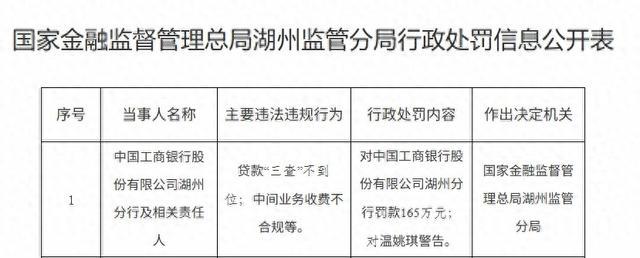 行政处罚决定书显示,中国工商银行湖州分行在日常经营中,存在贷款“三查”不到位和中间业务收费不合规等问题,国家金融监督管理总局湖州监管分局对湖州工行分行处以165万元罚款,同时对相关责任人温姚琪给予警告处罚。(信网记者)