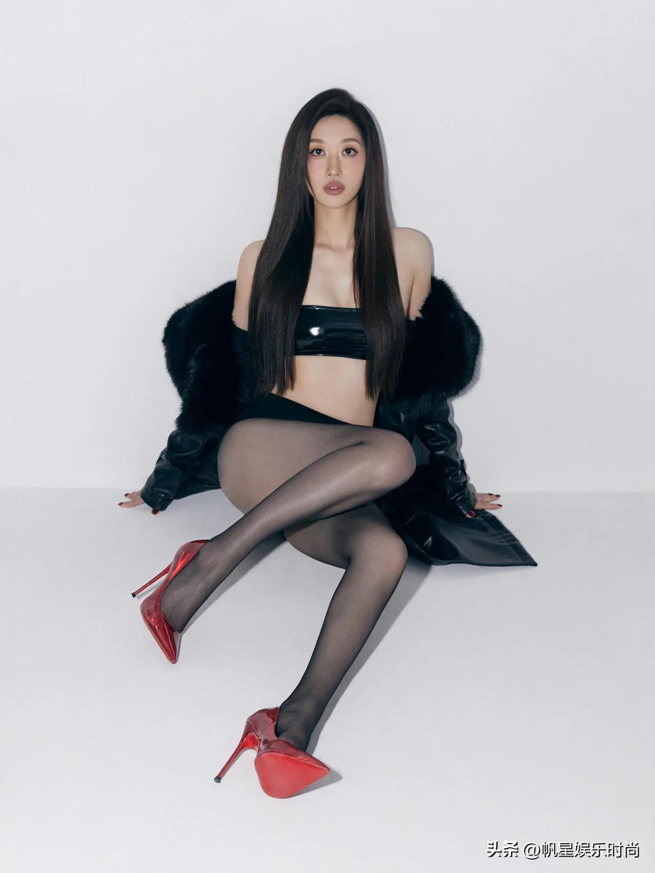 这身穿搭风格大胆,时尚张力十足。黑色皮质感抹胸尽显利落性感,搭配黑色高腰短裤优化身材比例。外搭的黑色毛绒外套增添了几分奢华与强大气场,黑色丝袜与下装完美衔接。最后,一双红色漆皮高跟鞋点亮了整体造型,撞色设计强化了视觉冲击。在简约背景的衬托下,整套搭配巧妙融合了性感、酷感与高级感,个性魅力展露无遗。
