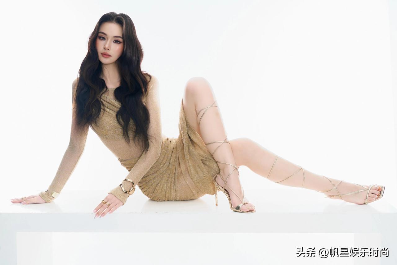 这身金棕色的网纱长裙轻盈而通透,贴合身形的裁剪巧妙地勾勒出曼妙曲线,褶皱设计更增添了层次感与立体感。金色细带高跟凉鞋与裙装色调相呼应,既精致又拉长了腿部线条。金属系的手镯、戒指等配饰为整体造型点缀出亮点。在简约的背景之下,整套搭配将时尚与魅惑完美融合,每一处细节都散发着迷人的魅力,仿佛在光影之间诉说着摩登故事。