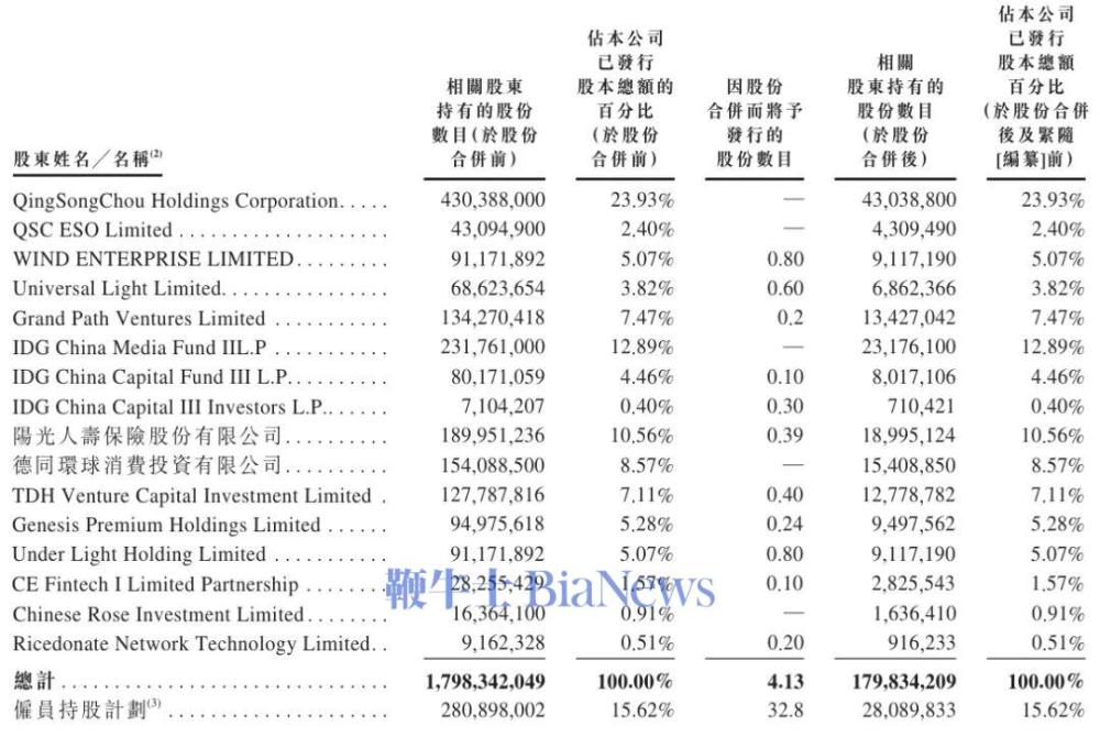 阳光人寿保险股份有限公司持股为10.56%,德同环球消费投资有限公司持股为8.57%,ZHAOHui旗下TDHVentureCapitalInvestment持股为7.11%,SHAOYangDong旗下GenesisPremiumHoldings持股为5.28%,UnderLightHolding持股为5.07%,CheYong旗下CEFintechILimitedPartnership持股为1.57%;