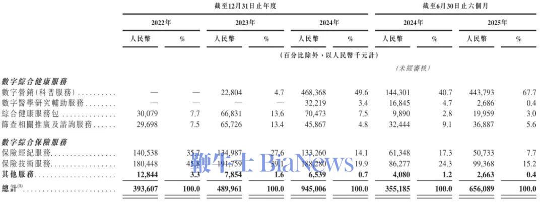 轻松健康集团2025年上半年最大收入来源为数字营销(科普服务),达到4.44亿元,占营收的比例为67.7%;来自筛查香港推广及咨询服务的收入为3669万元,占营收的比例为5.6%。