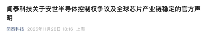 28日闻泰科技发文《关于安世半导体控制权争议及全球芯片产业链稳定的官方声明》,原文如下: