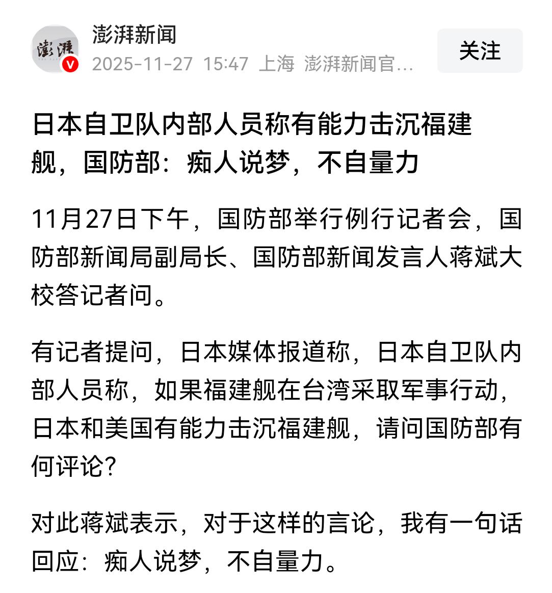 击沉中国航母??? 这是日本向中国发出的战争口号, 如果中国武力统一,阻止他们介入! 到时他们将击沉福建号航母! 先不说是口嗨,还是真有实力! 日本什么时候允许有战略进攻性武器了?允许大规模杀伤性武器了? 二战后他们的国防方针“专防守卫”,他们只能防卫自己领空、领海区域,什么时候可以去别的海域耀武扬威了? 日本二战给我国和东南亚各国造成无法弥补的创伤,现在不反思,不道歉,还一而再扩充海上自卫队力量,拓展防卫范围。 现在日本战争之心昭然若揭,帝国主义右翼分子猖狂至极! 再说日本真有击沉航母的实力吗? 看下日本海上自卫队主要舰艇和吨位! 日本屡越红线 中方“亮剑” 爆料 福建号航空母舰 解放军2万吨级“全能战舰”要来了吗 对待日本人应该什么态度