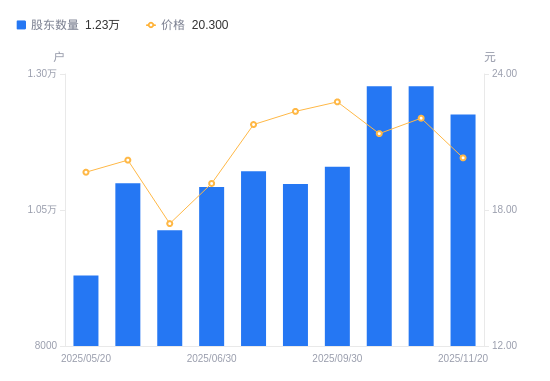 日期A股户数(户)流通A股户均持股数(股)户均持股市值(万元)2025-10-311277310026.8821.432025-09-30112949657.3121.992025-09-20109809839.8921.992025-07-31112149633.7720.972025-06-30109249889.5218.962025-06-201013010663.0618.552025-06-10109919827.7519.852025-05-2092968294.1616.312025-04-1894608150.3313.122025-04-1097507907.9111.82
