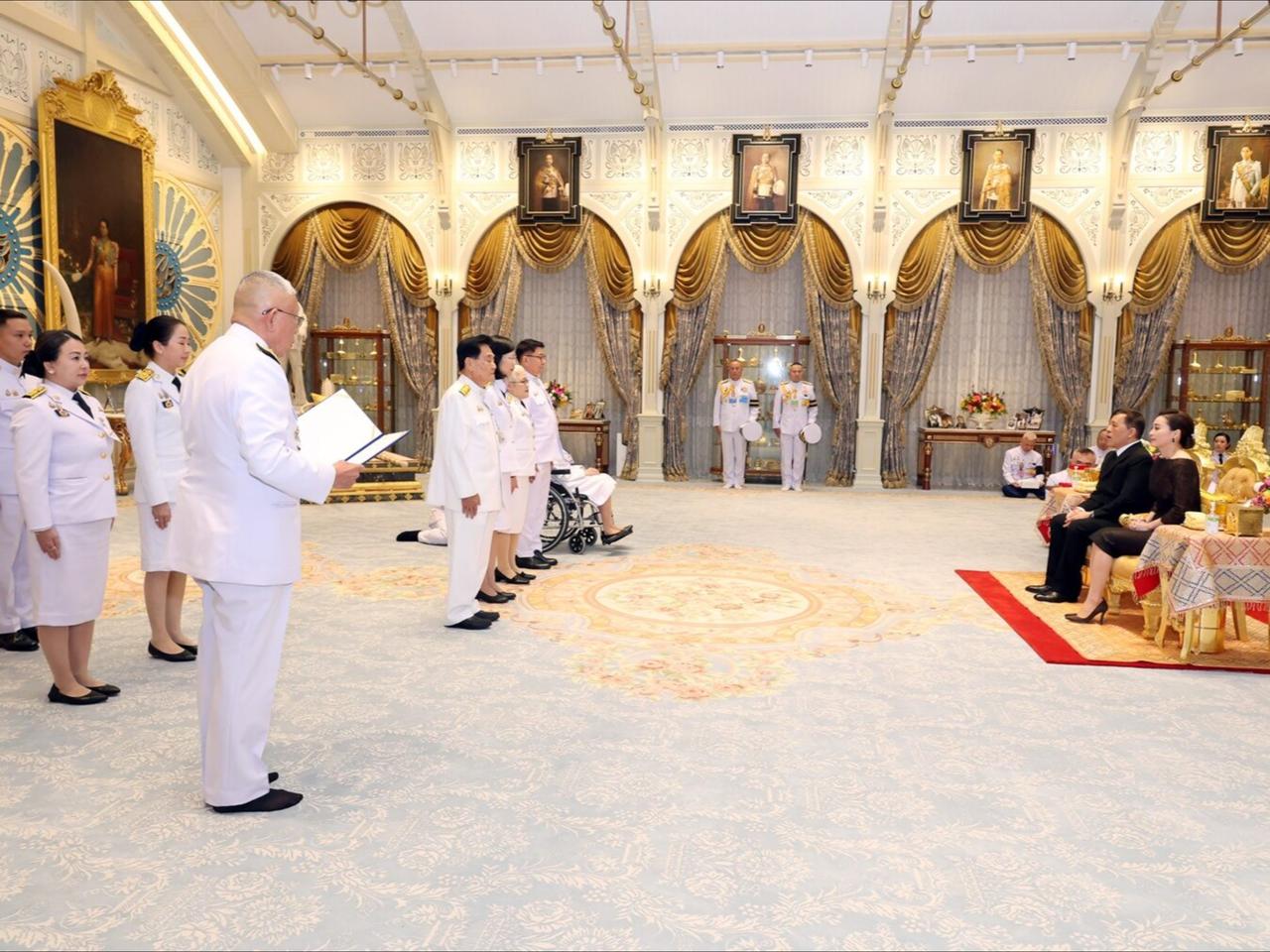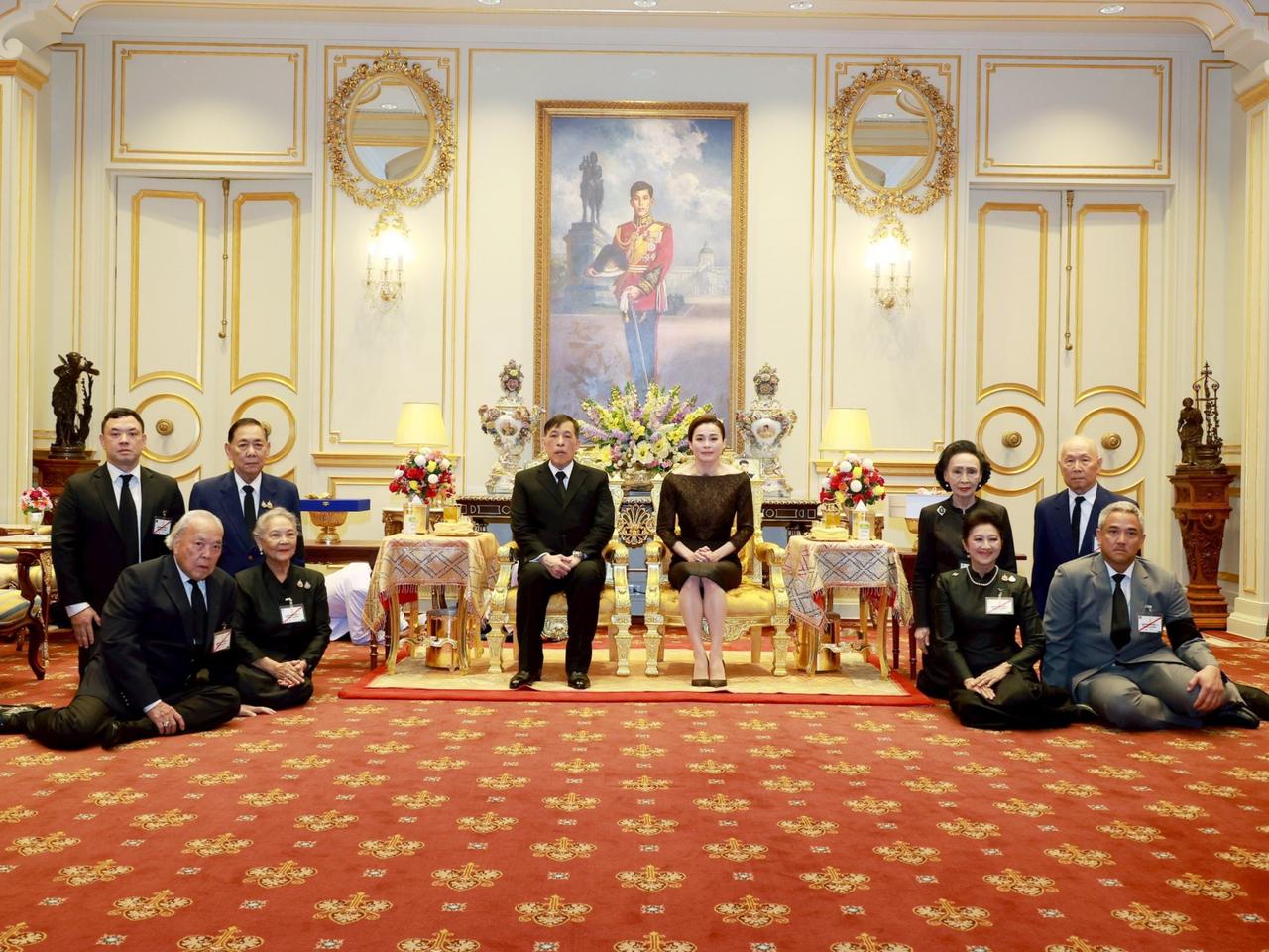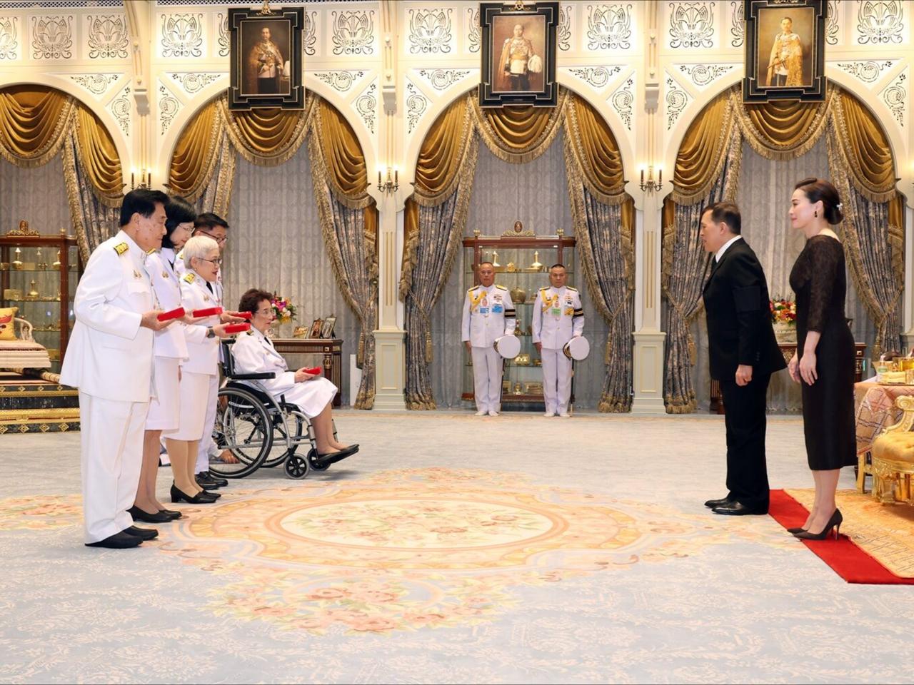 苏提达大气端庄,一袭棕色礼服好优雅 国王和王后,先接见了苏维特·昂萨瓦南达及星期五乐团成员,大家送上对国王2025年生日的美好祝愿。1952年,普密蓬国王批准成立乐团广播电台,它多次助力救灾。A.S.星期五乐队每周五演出,国王等还参与其中。后来,国王王后又接见在艺术科学领域有杰出贡献的学者,并授予奖章。