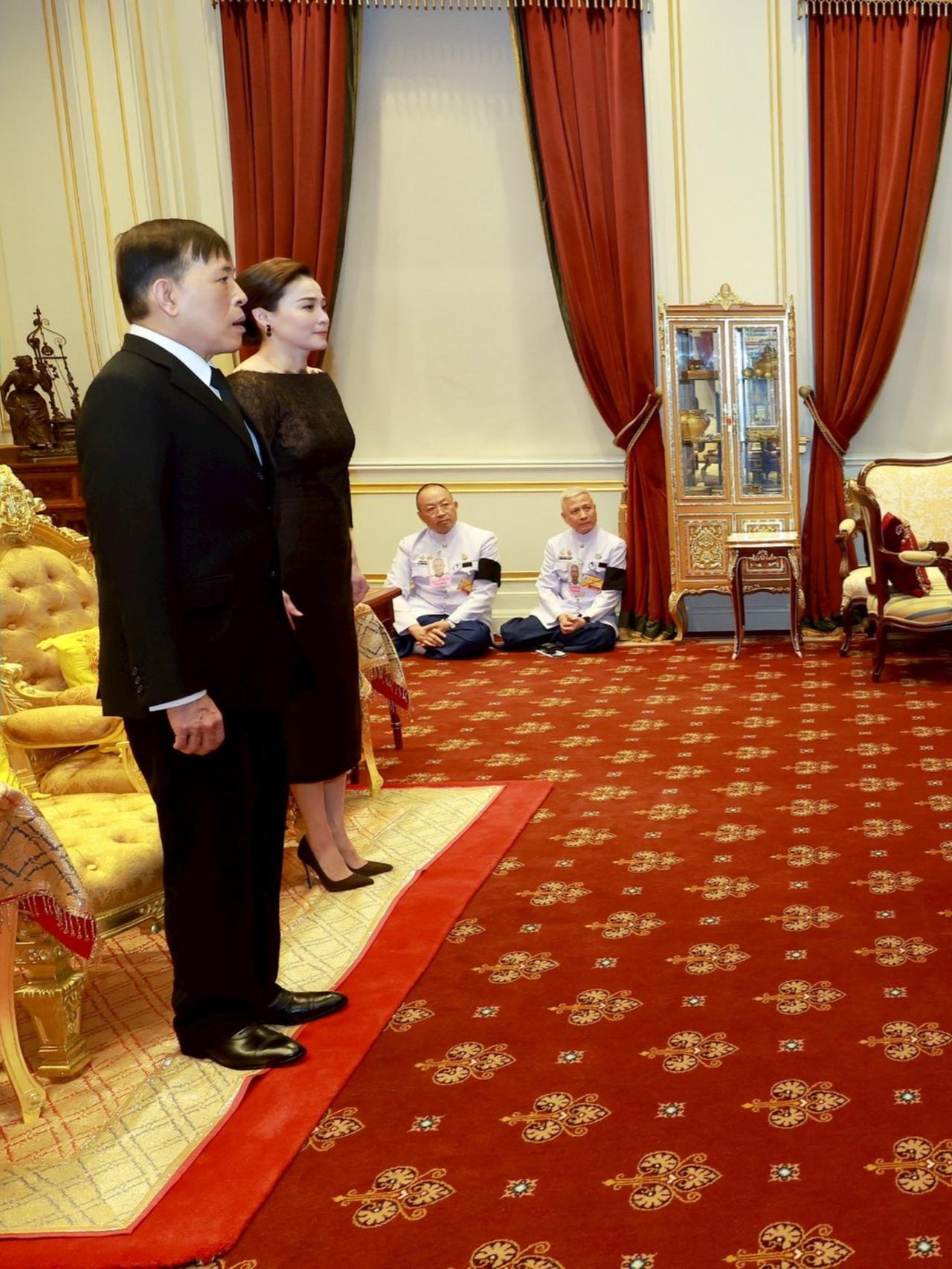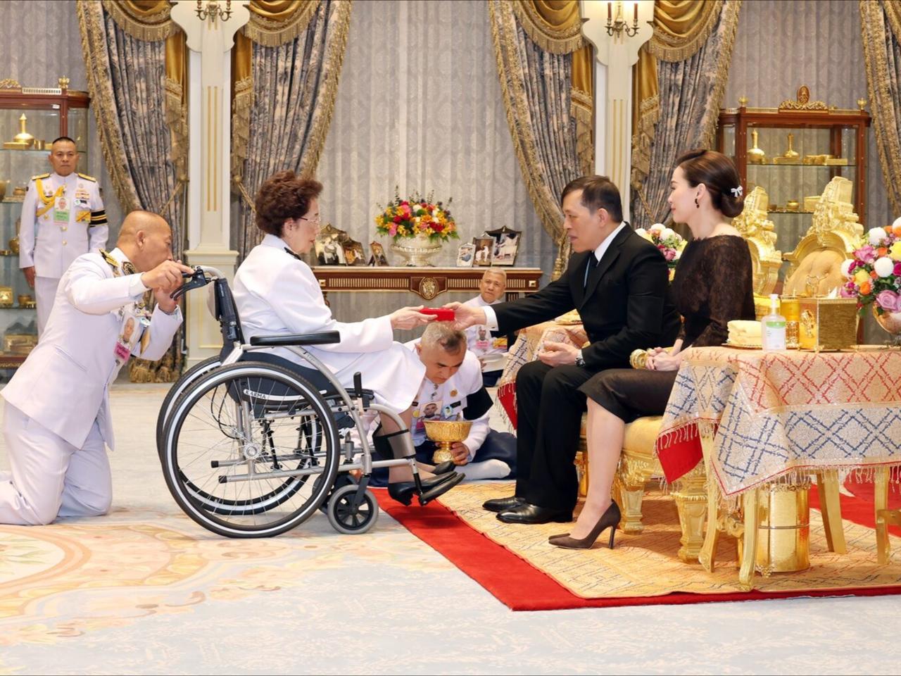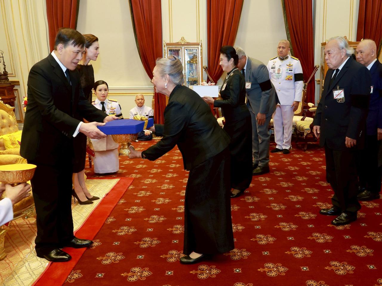 苏提达大气端庄,一袭棕色礼服好优雅 国王和王后,先接见了苏维特·昂萨瓦南达及星期五乐团成员,大家送上对国王2025年生日的美好祝愿。1952年,普密蓬国王批准成立乐团广播电台,它多次助力救灾。A.S.星期五乐队每周五演出,国王等还参与其中。后来,国王王后又接见在艺术科学领域有杰出贡献的学者,并授予奖章。