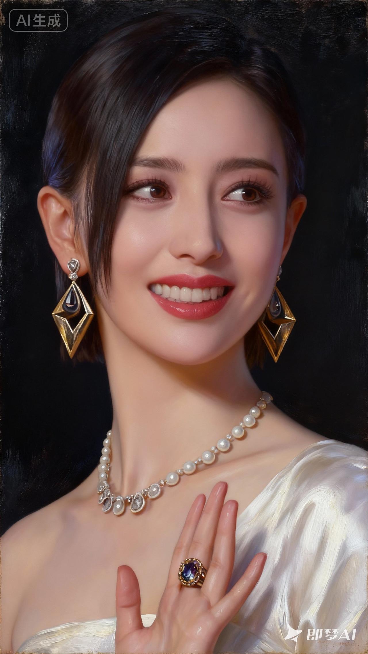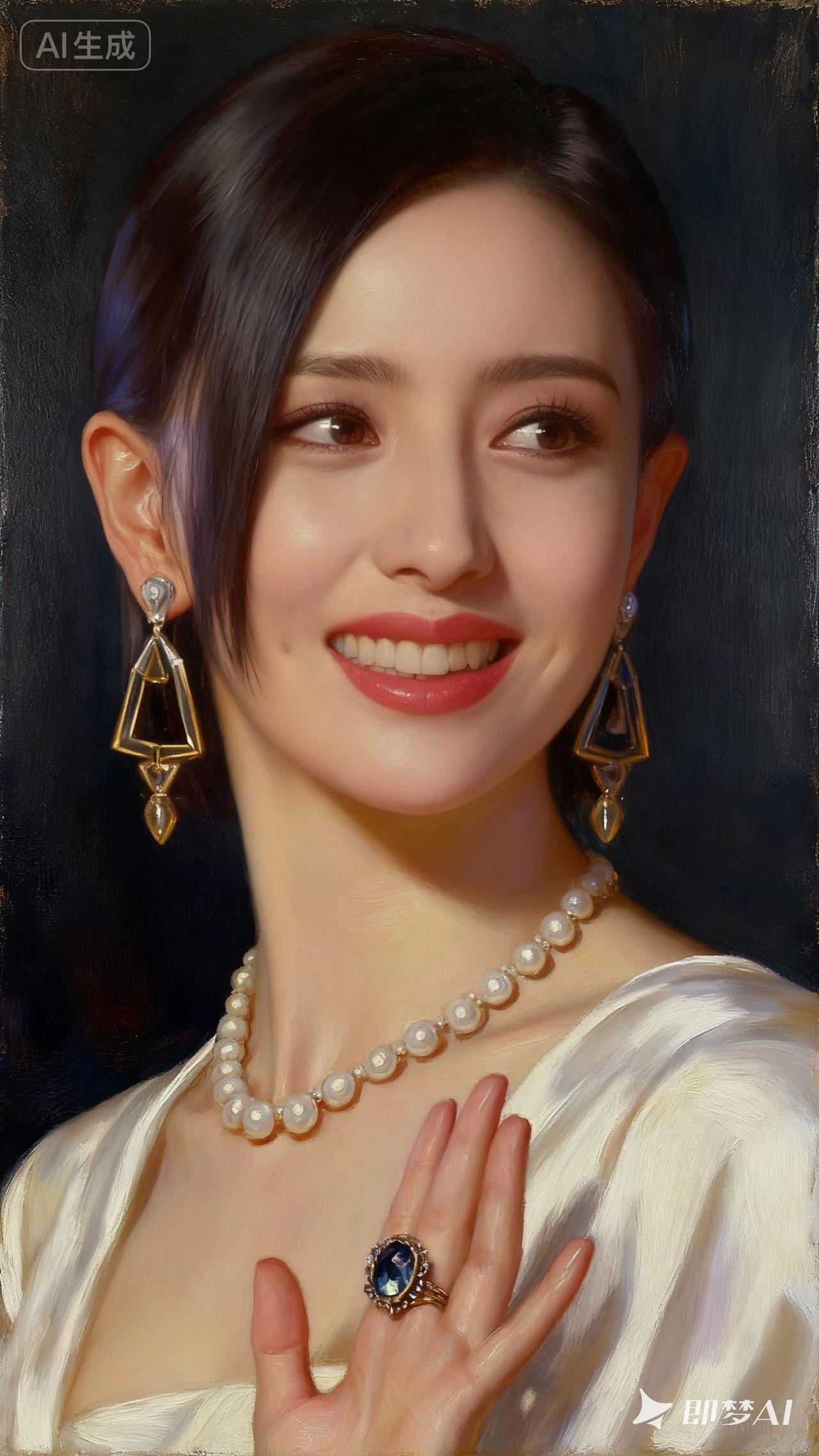 优雅知性美人银白服饰配精致配饰,轻回眸甜笑,发丝飘逸眼眸含情。神韵灵动,完美捕捉