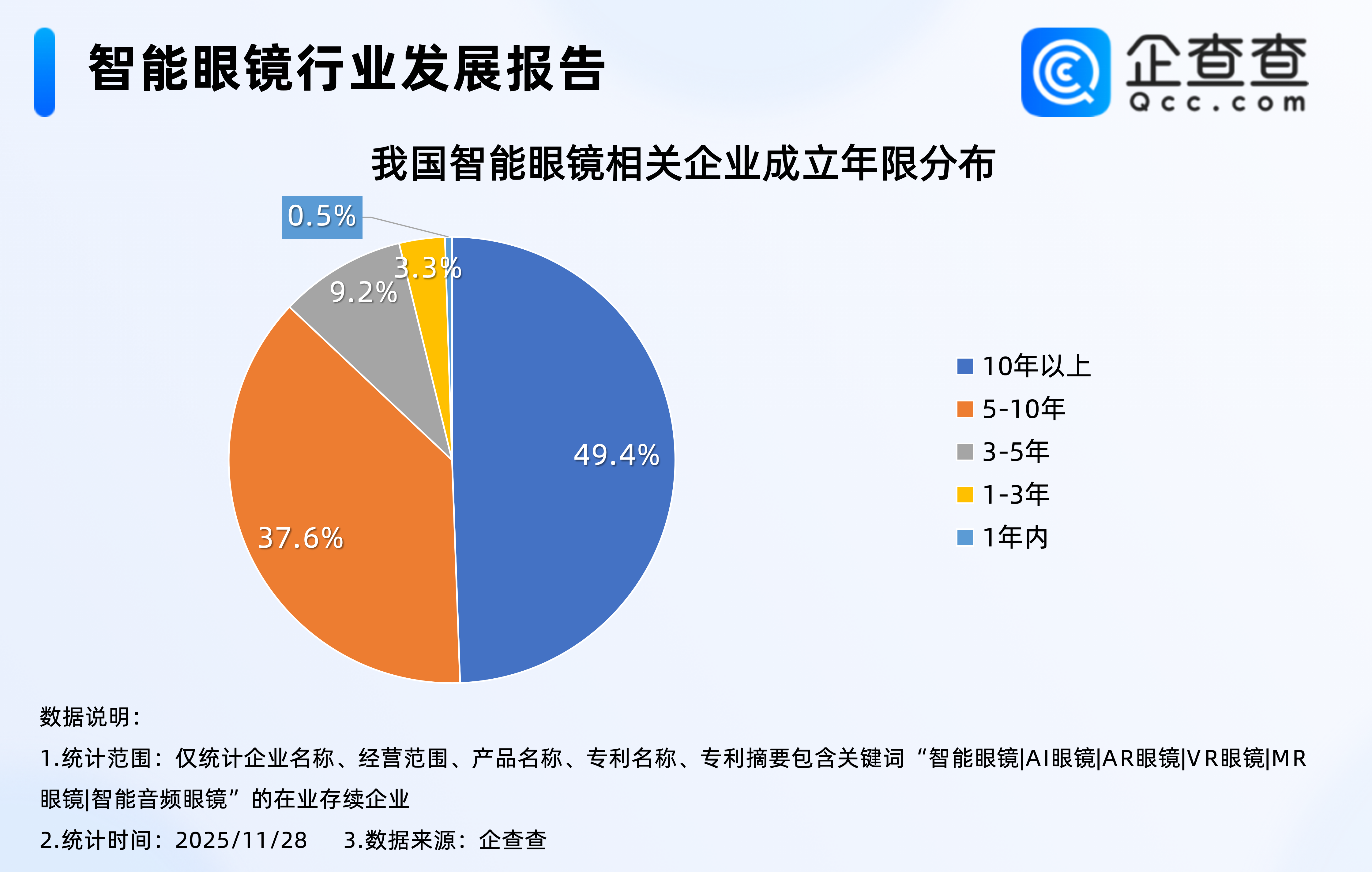 企查查数据显示,我国智能眼镜领域以老牌企业为主,成立超10年的企业最多,占比49.4%,其次是成立5至10年之间的企业,占比37.6%;综合来看,成立5年以上的企业合计占比近九成。