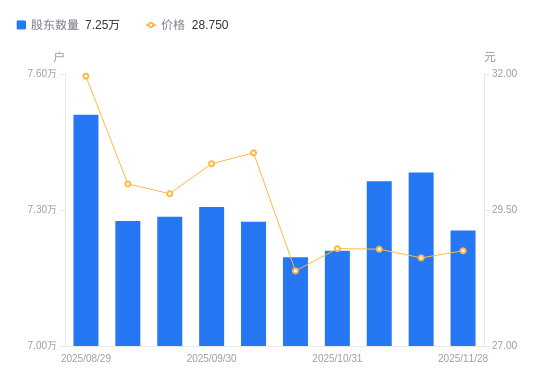 日期A股户数(户)流通A股户均持股数(股)户均持股市值(万元)2025-11-287254911322.2032.552025-11-207382711126.2031.842025-11-107363311155.5232.112025-10-317210011392.7132.802025-10-207195611415.5132.402025-10-107274011292.4734.502025-09-307306511242.2434.122025-09-197285011275.8133.602025-09-107275811290.0733.852025-08-297510010937.9934.96