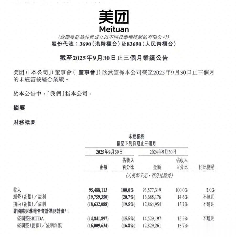 11月28日,美团发布2025年第三季度业绩报告,交出了近三年来首份季度亏损成绩单。财报显示,公司期内实现营收955亿元,同比仅微增2%,显著低于市场预期的974.7亿元;经调整后净亏损高达160亿元,而去年同期为128亿元的盈利,盈利与亏损的巨大反差凸显公司经营陷入严重困境。