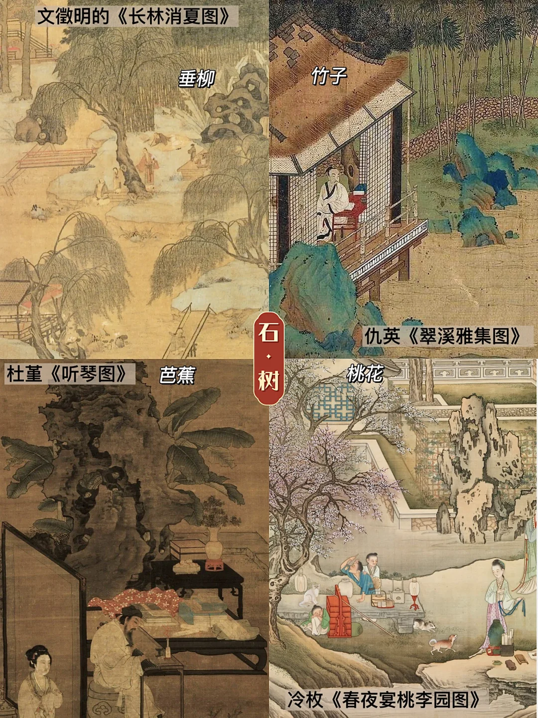 🪷植物、花卉是园林必不可少的元素,垂柳摇曳、松柏坚韧、芭蕉兴旺、牡丹富贵、桃花灿烂、竹木高洁,它们因地制宜、完美融入,通过文徵明的《长林消夏图》、仇英的《翠溪雅集图》、杜堇的《听琴图》、冷枚的《春夜宴桃李园图》等作品生动地呈现出来。