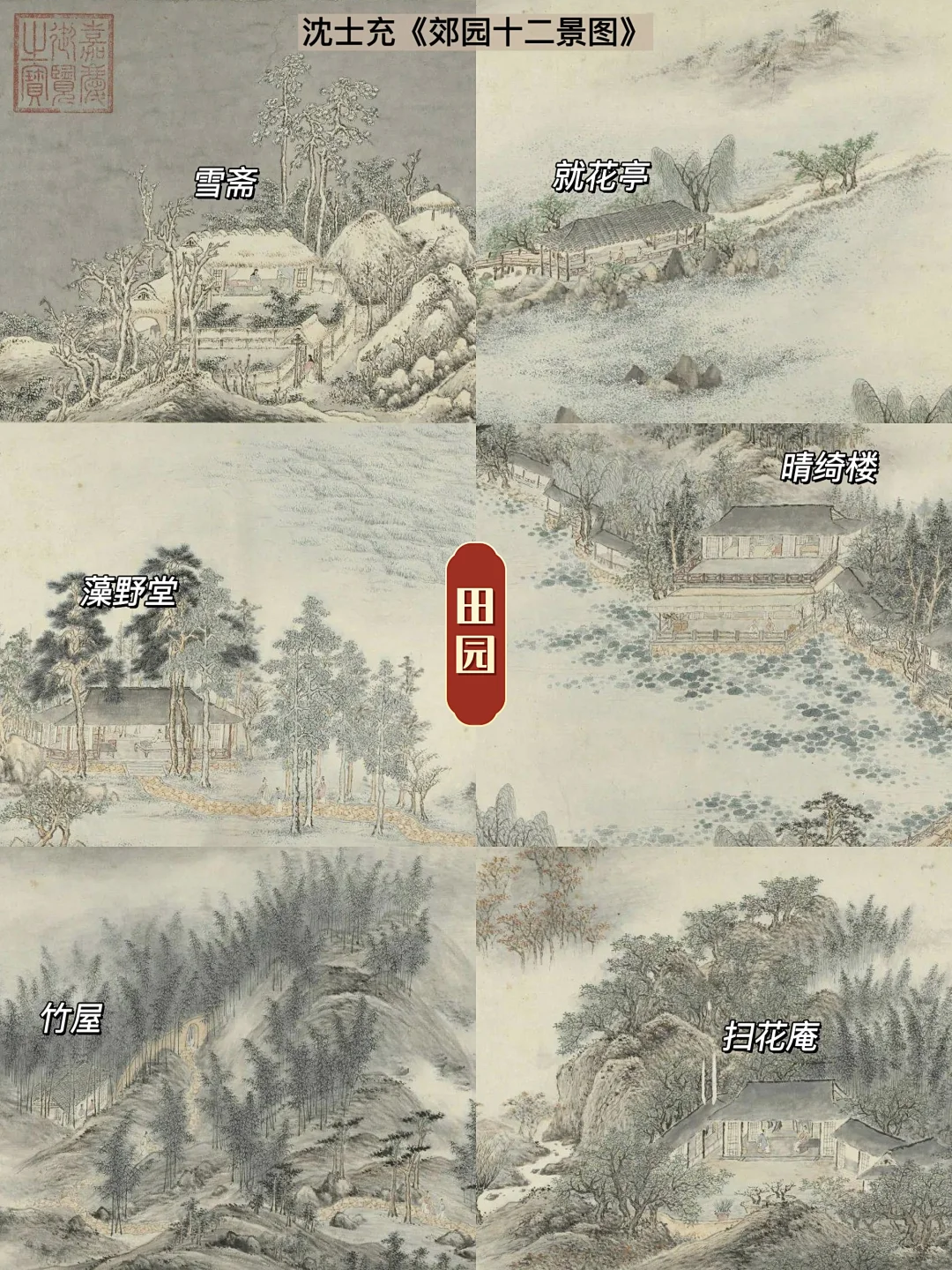沈士充在《郊园十二景图》中,展现出梅林遍野、荷花盛放、桂香弥漫、白雪皑皑等四季分明的风光。