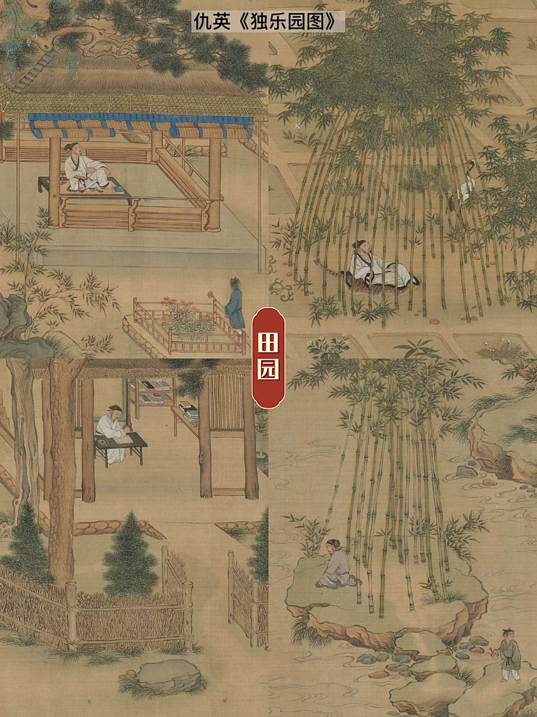 🎋时至明代,园林的乡野气息更为浓厚,仇英在《独乐园图》中,构建出弄水轩、读书堂、钓鱼庵、种竹斋、采药圃、浇花亭、见山堂等别出心裁的场所。