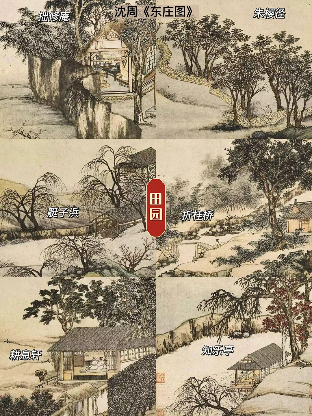 沈周在《东庄图》中,描绘出河滩、菱舟、小桥、溪岸、果林、麦山、祠堂、书斋、桑林、芦苇等相映成趣的景观。